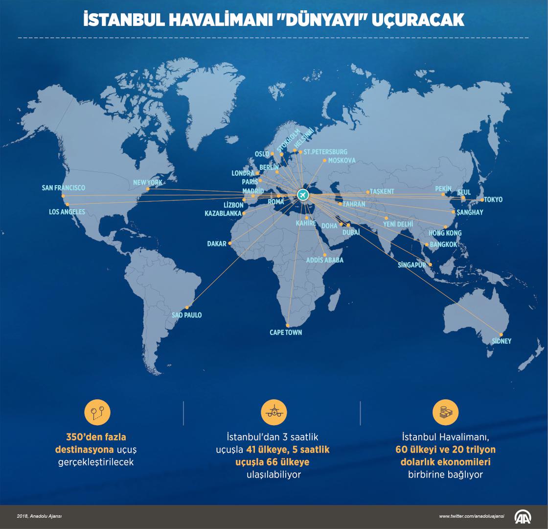 Türkiye Cumhurbaşkanı Recep Tayyip Erdoğan ve çok sayıda üst düzey yabancı konuğun katılımıyla dün ilk fazı hizmete açılan İstanbul Havalimanı, 3 saatlik uçuşla 41 ülkeye, 5 saatlik uçuşla 66 ülkeye ulaşım imkanı sağlayacak. Burası, 250'si dış hatlar olmak üzere 300'den fazla uçuş noktasıyla dünyanın en önemli havacılık merkezlerinden biri olacak.
