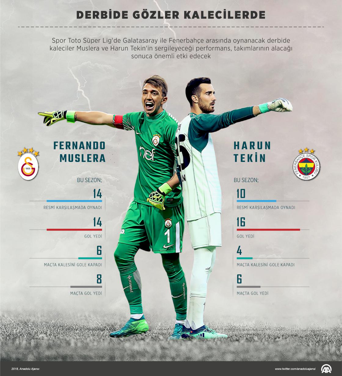 Spor Toto Süper Lig'de Galatasaray ile Fenerbahçe arasında 2 Kasım Cuma günü oynanacak derbide gözler iki takımın kalecilerinde olacak. Türk Telekom Stadı'nda yapılacak karşılaşmada kaleyi korumaları beklenen Galatasaray'ın 32 yaşındaki Uruguaylı kalecisi Fernando Muslera ile Fenerbahçe'nin 29 yaşındaki file bekçisi Harun Tekin'in sergileyeceği performans, derbinin sonucuna doğrudan etki edecek.