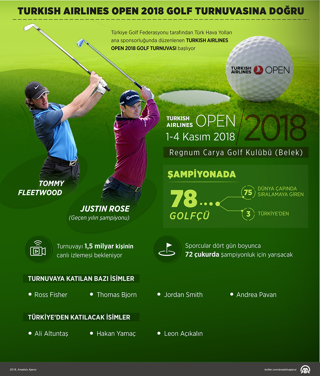 Türkiye Golf Federasyonu tarafından Türk Hava Yolları ana sponsorluğunda düzenlenen Turkish Airline Open 2018 golf turnuvası yarın başlıyor. Serik ilçesi Belek Turizm Merkezi'nde bulunan Regnum Carya Golf Kulübünde başlayacak şampiyonada dünya çapında sıralamaya giren 75 ve Türkiye'den de 3 olmak üzere 78 golfçü mücadele edecek.31 Ekim 2018•Güncelleme: 31 Ekim 2018