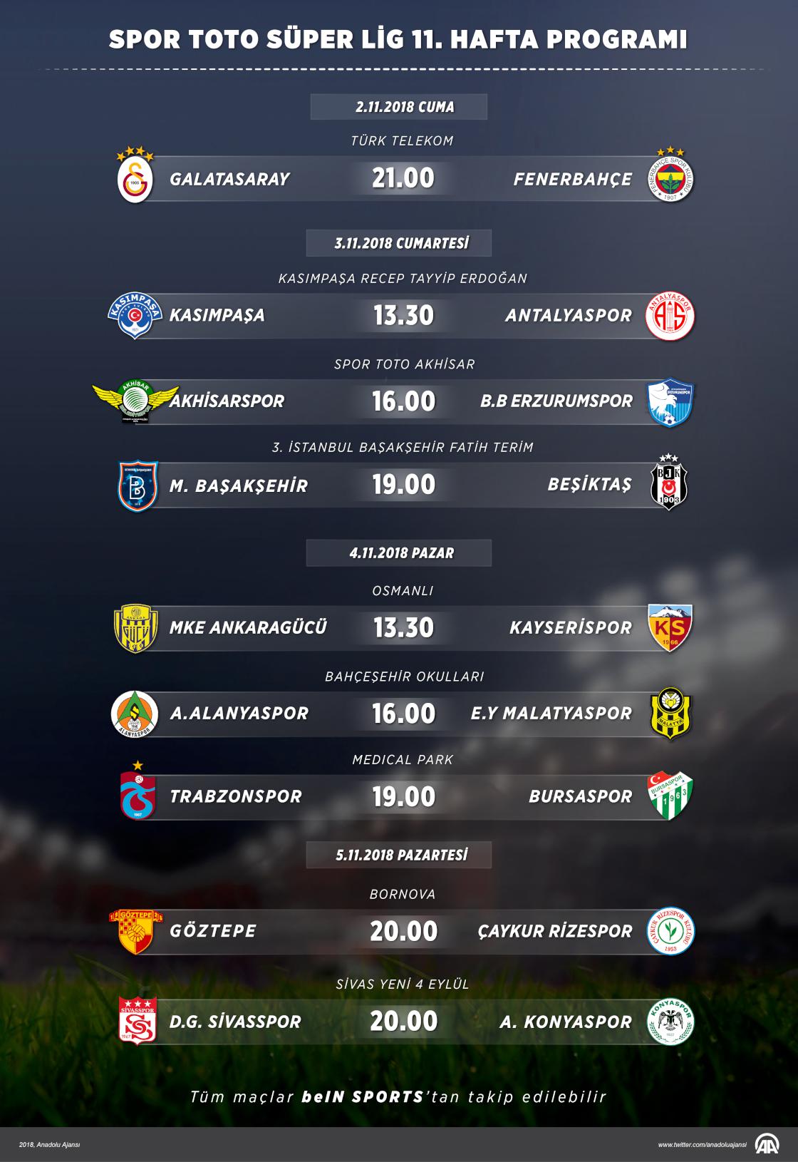 Spor Toto Süper Lig'de 11. haftanın açılış maçında bugün Galatasaray ile Fenerbahçe karşı karşıya gelecek. Ligde 3 Kasım Cumartesi ve 4 Kasım Pazar günü 3, 5 Kasım Pazartesi ise 2 maç oynanacak.
