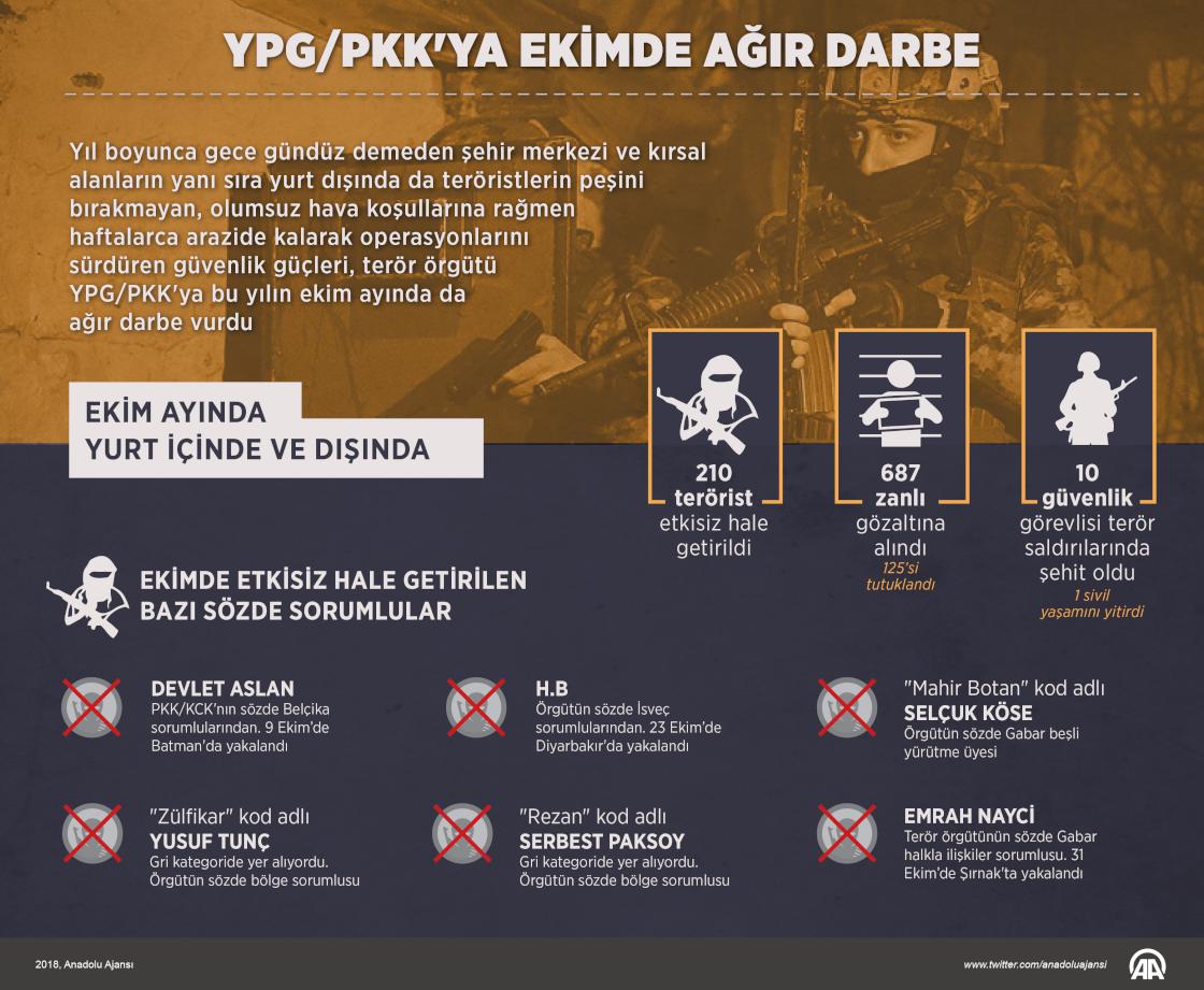 Türkiye'nin barış, huzur ve güvenliğini bozmak için sivilleri, çocukları ve bebekleri dahi hedef almaktan çekinmeyen terör örgütü YPG/PKK'ya yönelik ekimde yurt içi ve dışında düzenlenen operasyonlarda, aralarında örgütün sözde sorumlularının da bulunduğu 210 terörist etkisiz hale getirildi. ( Muhammed Ali Yiğit - Anadolu Ajansı )02 Kasım 2018•Güncelleme: 02 Kasım 2018