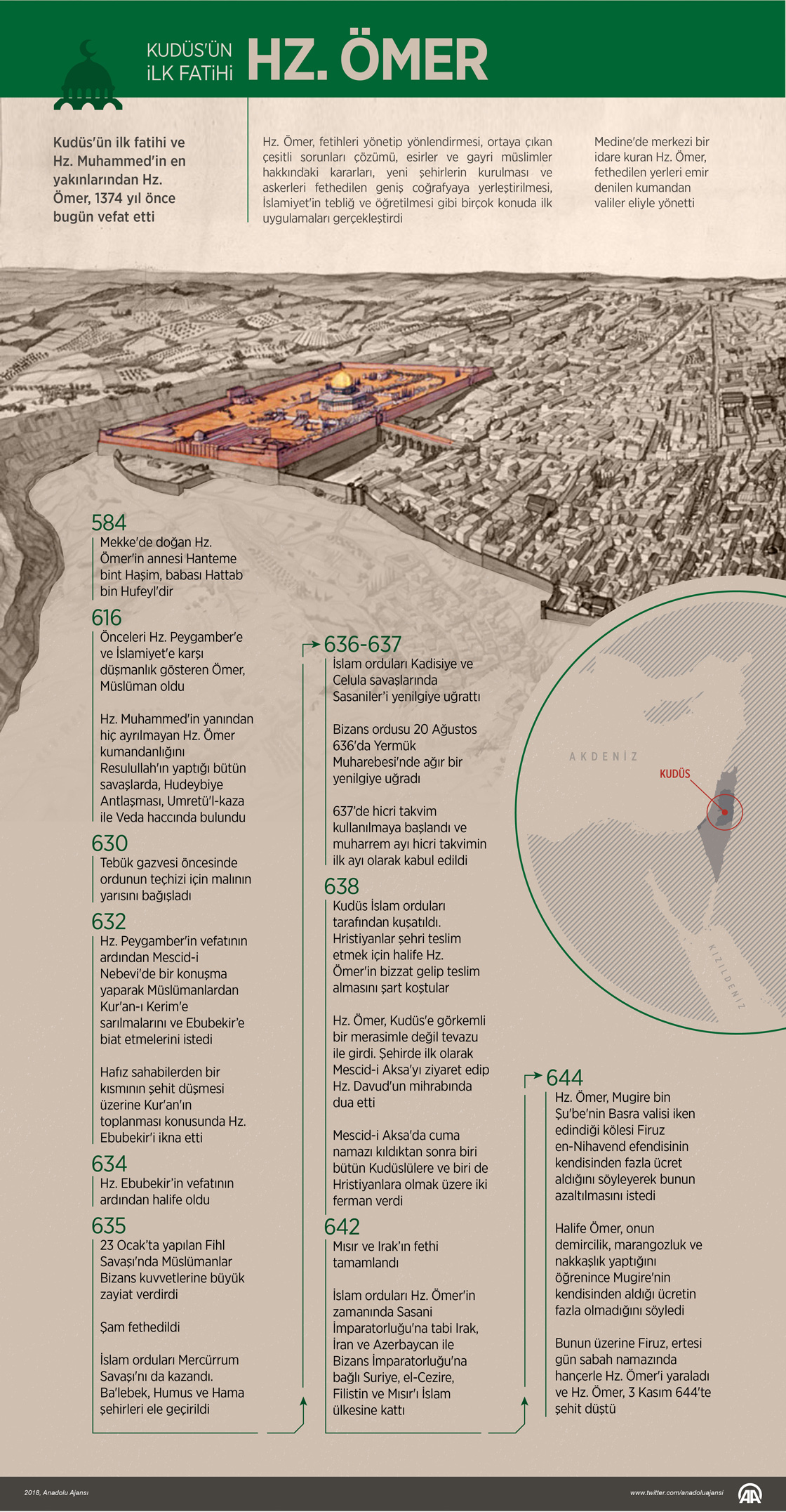 Adaletiyle nam salan, Kudüs'ün ilk fatihi ve Hz. Muhammed'in en yakınlarından ikinci İslam halifesi Hz. Ömer, 1374 yıl önce bugün vefat etti. Kudüs'e görkemli bir merasimle değil tevazu ile giren Hz. Ömer, Hristiyan ve Yahudilerin ibadethanelerine dokunmadı, onların can ve mal güvenliklerini garanti etti. Gerek Müslümanlar ve gerekse gayrimüslimlerle ilgili verdiği karar ve uygulamaları dolayısıyla adaletine güvenilen ve sığınılan bir halife olarak anılan Hz. Ömer, fethedilen yerlerde halkı Müslüman olmaya zorlamadı, can mal ve inanç hürriyetini koruma altına aldı. ( Ahmet Burak Özkan - Anadolu Ajansı )03 Kasım 2018•Güncelleme: 03 Kasım 2018