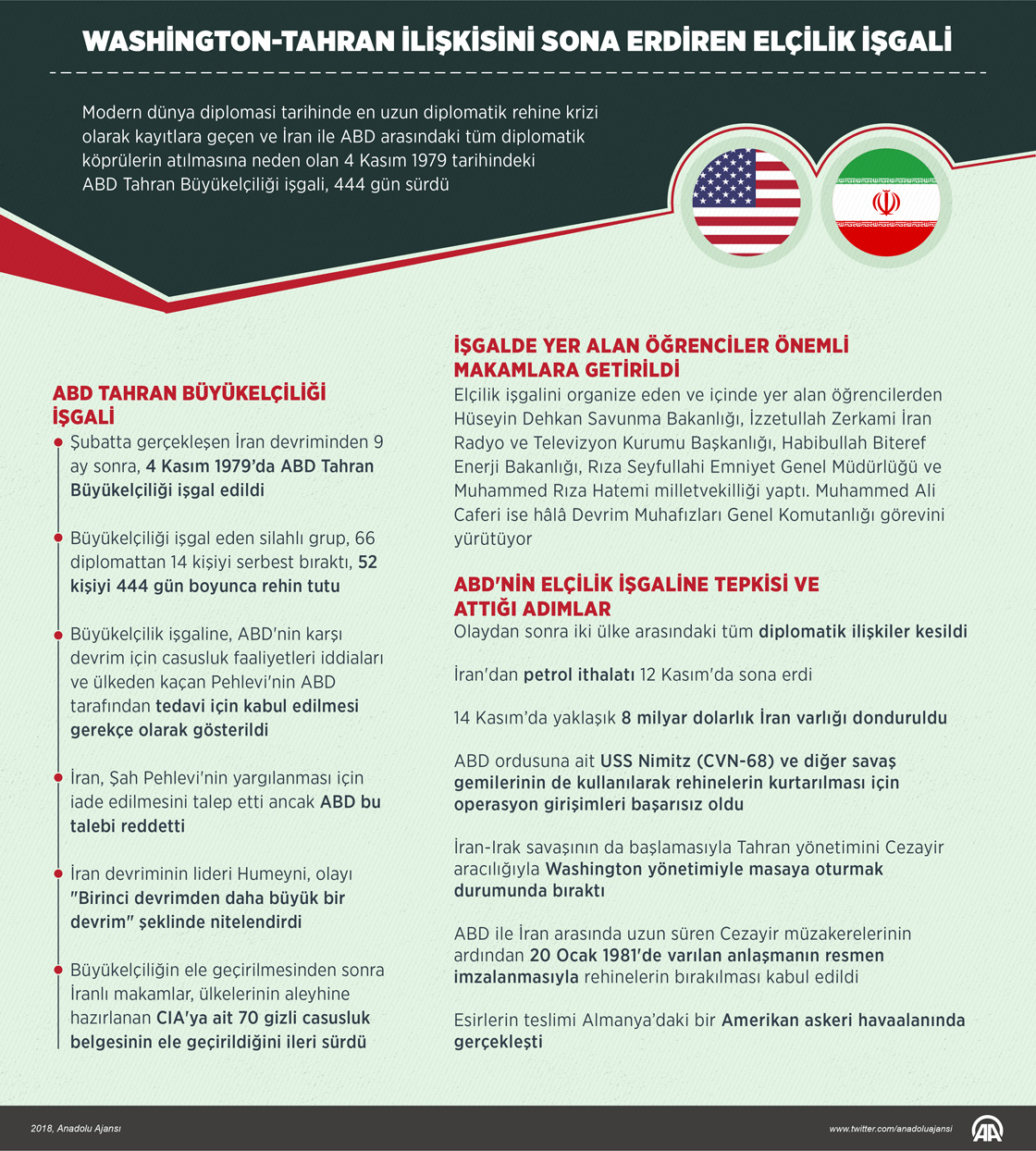 İran Şahı Muhammed Şah Rıza Pehlevi'nin monarşik yönetimine son verilen 10 Şubat 1979 devriminin ardından devrim lideri Ayetullah Ruhullah Humeyni'nin "birincisinden daha büyük bir devrim" olarak nitelendirdiği ve İran ile ABD arasındaki tüm diplomatik köprülerin atılmasına neden olan 4 Kasım 1979 tarihindeki ABD Tahran Büyükelçiliği işgalinin üzerinden 39 yıl geçti. ( Muhammed Ali Yiğit - Anadolu Ajansı )04 Kasım 2018•Güncelleme: 04 Kasım 2018