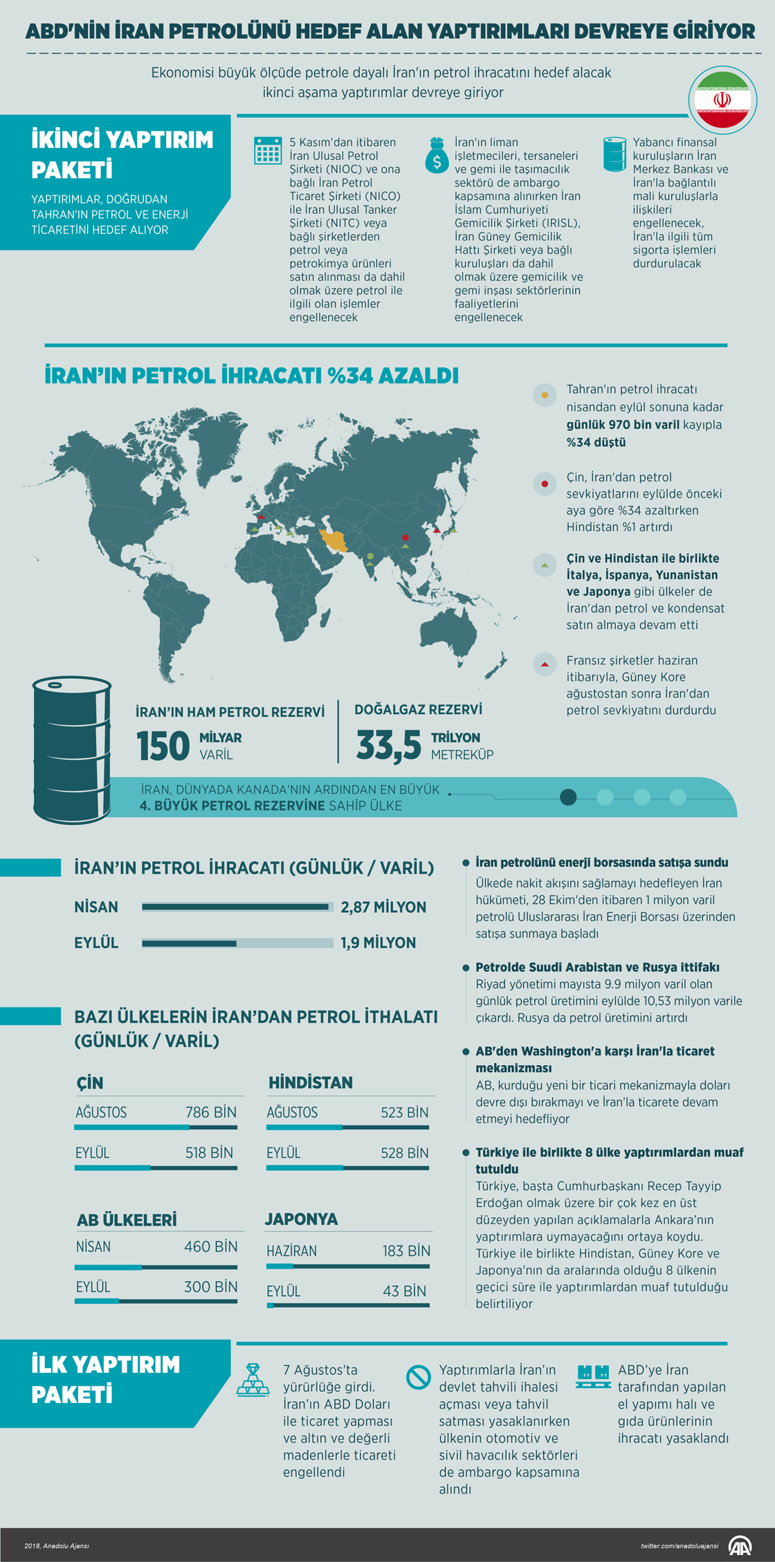 Ekonomisi büyük ölçüde petrole dayalı İran'ın petrol ihracatını hedef alacak ikinci aşama yaptırımlar yarın devreye giriyor. İran'a yönelik ambargoların ikinci aşamasını içeren yaptırımlar, doğrudan Tahran'ın petrol ve enerji ticaretini hedef alıyor. ( Gözde Gültekinler - Anadolu Ajansı )04 Kasım 2018•Güncelleme: 04 Kasım 2018