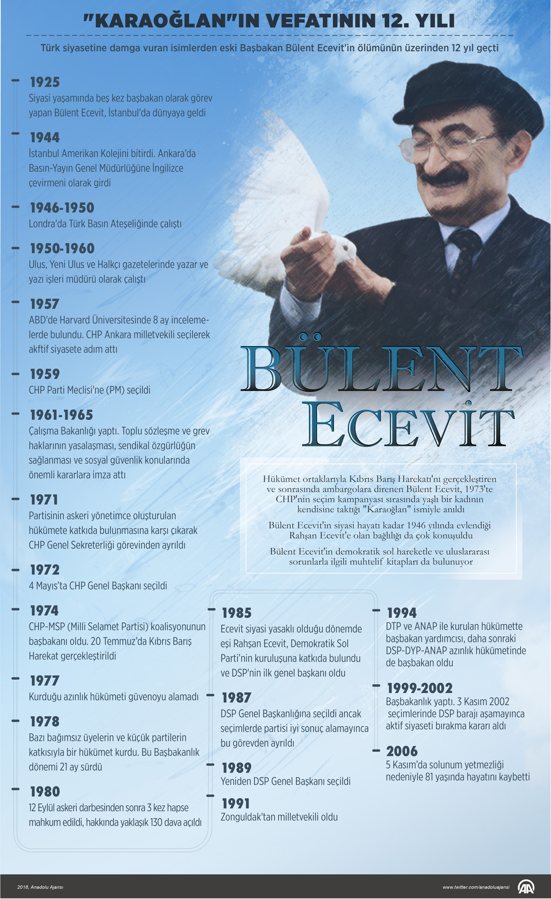 Türk siyasetine damga vuran isimlerden eski Başbakan Bülent Ecevit'in ölümünün üzerinden 12 yıl geçti. AA muhabirinin derlediği bilgilere göre, siyasi hayatının yanı sıra şair ve gazeteci kimliği, Rahşan Ecevit'le hiç kopmayan birlikteliği ile de tanınan Bülent Ecevit, 5 Kasım 2006'da yaşama veda etti. Siyasi yaşamında beş kez başbakan olarak görev yapan Bülent Ecevit, 1925'te İstanbul'da doğdu. Babası Prof. Dr. Fahri Ecevit Ankara Üniversitesinde adli tıp profesörü ve 1943-50 arasında da Kastamonu milletvekili idi. Annesi Nazlı Ecevit ise ressamdı. ( Gözde Gültekinler - Anadolu Ajansı )05 Kasım 2018•Güncelleme: 05 Kasım 2018