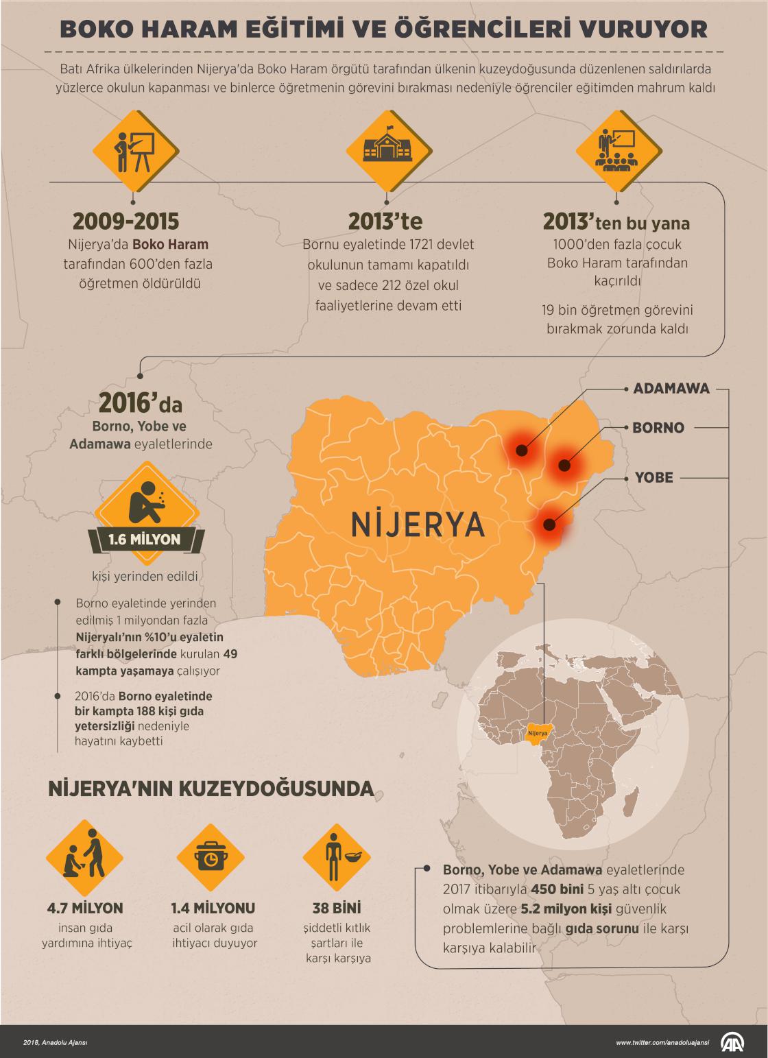 Batı tarzı eğitime karşı olan Boko Haram'ın 2009'dan beri düzenlediği saldırılar nedeniyle on binlerce öğrenci eğitimden mahrum kalıyor. BM verilerine göre 2013'ten bu yana ülkede binden fazla okul çağındaki çocuk kaçırıldı. 19 bin öğretmen güvenlik endişesi nedeniyle görevlerini bırakmak zorunda kaldı. Çatışmalar nedeniyle Borno, Yobe ve Adamawa eyaletlerinde 2009'da yaklaşık 100 bin kişi yerinden edilirken bu sayı 2016 yılında 1,6 milyona yükseldi. ( Gözde Gültekinler - Anadolu Ajansı )07 Kasım 2018•Güncelleme: 07 Kasım 2018