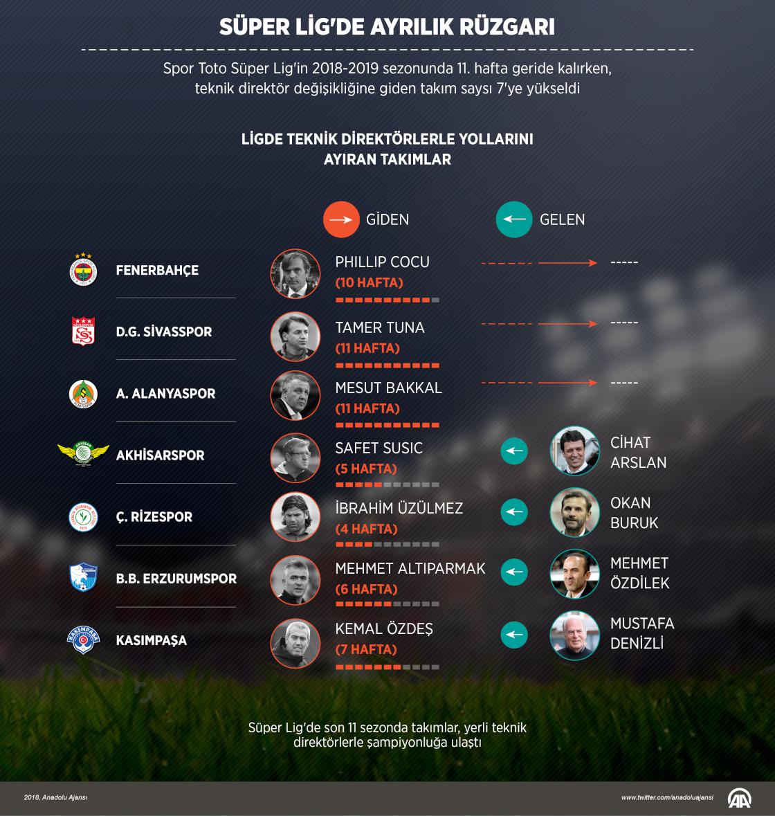 Spor Toto Süper Lig'in 2018-2019 sezonunda 11. hafta geride kalırken, teknik direktör değişikliğine giden takım saysı 7'ye yükseldi. ( Ahmet Burak Özkan - Anadolu Ajansı )