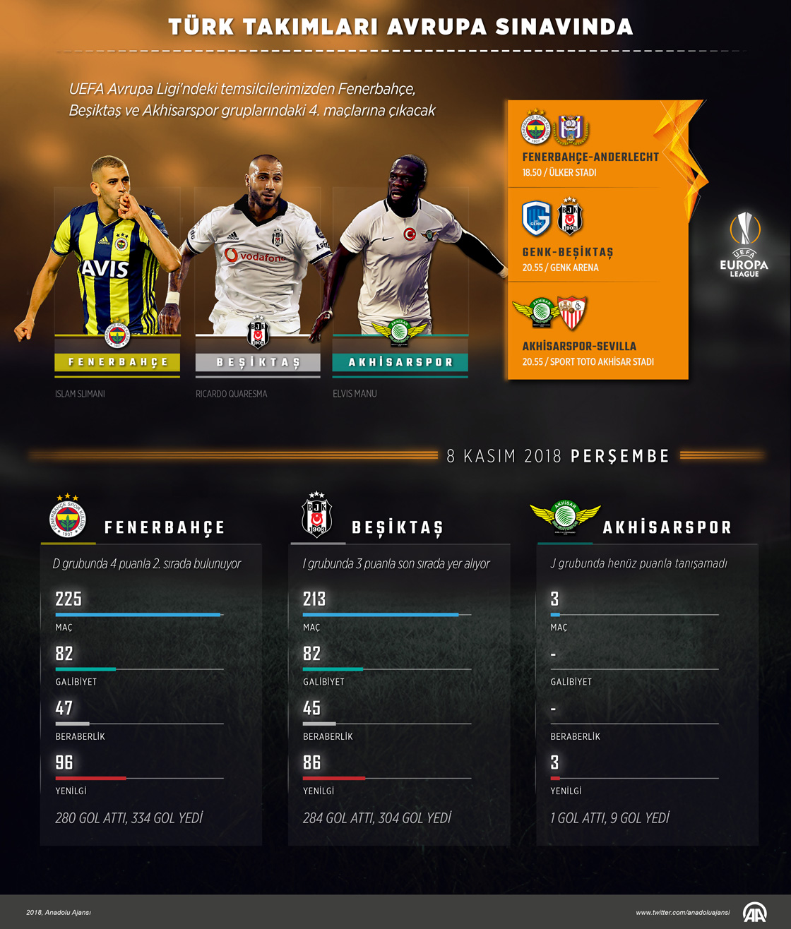 UEFA Avrupa Ligi'ndeki temsilcilerimizden Fenerbahçe, Beşiktaş ve Akhisarspor bugün gruplarındaki 4. maçlarına çıkacak. Fenerbahçe sahasında Anderlecht, Beşiktaş deplasmanda Genk ve Akhisarspor da evinde Sevilla ile karşı karşıya gelecek.