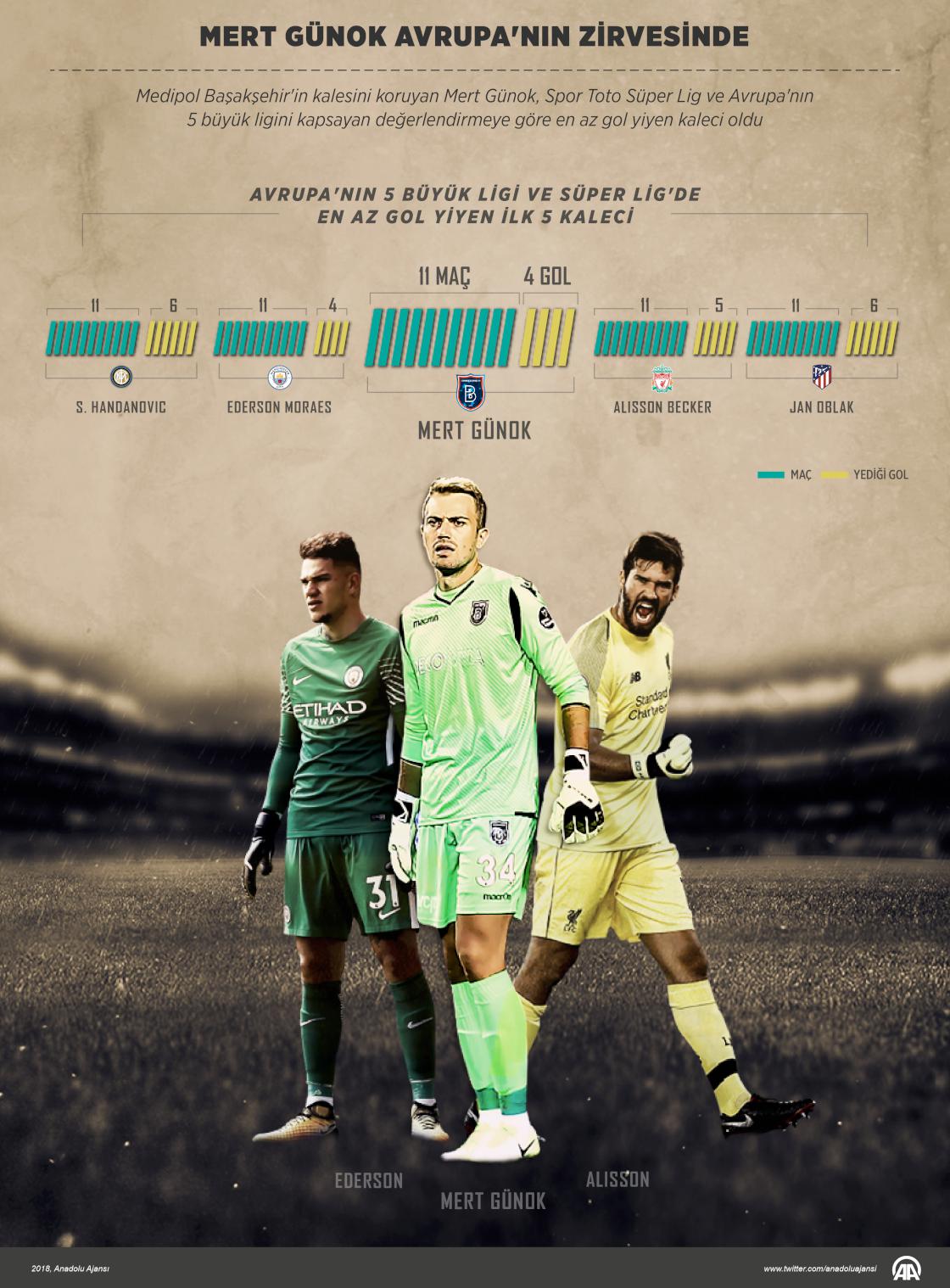 Medipol Başakşehir'in kalesini koruyan Mert Günok, Spor Toto Süper Lig ve Avrupa'nın 5 büyük ligini kapsayan değerlendirmeye göre en az gol yiyen kaleci oldu.