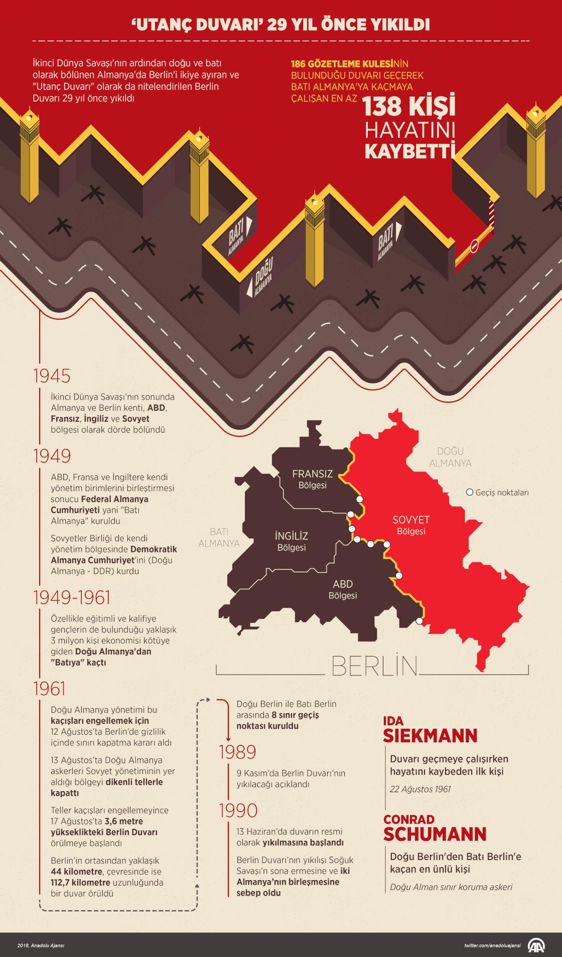 İkinci Dünya Savaşı'nın ardından doğu ve batı olarak bölünen Almanya'da Berlin'i ikiye ayıran ve "Utanç Duvarı" olarak da nitelendirilen Berlin Duvarı 29 yıl önce yıkıldı. ( Murat Usubaliev - Anadolu Ajansı )