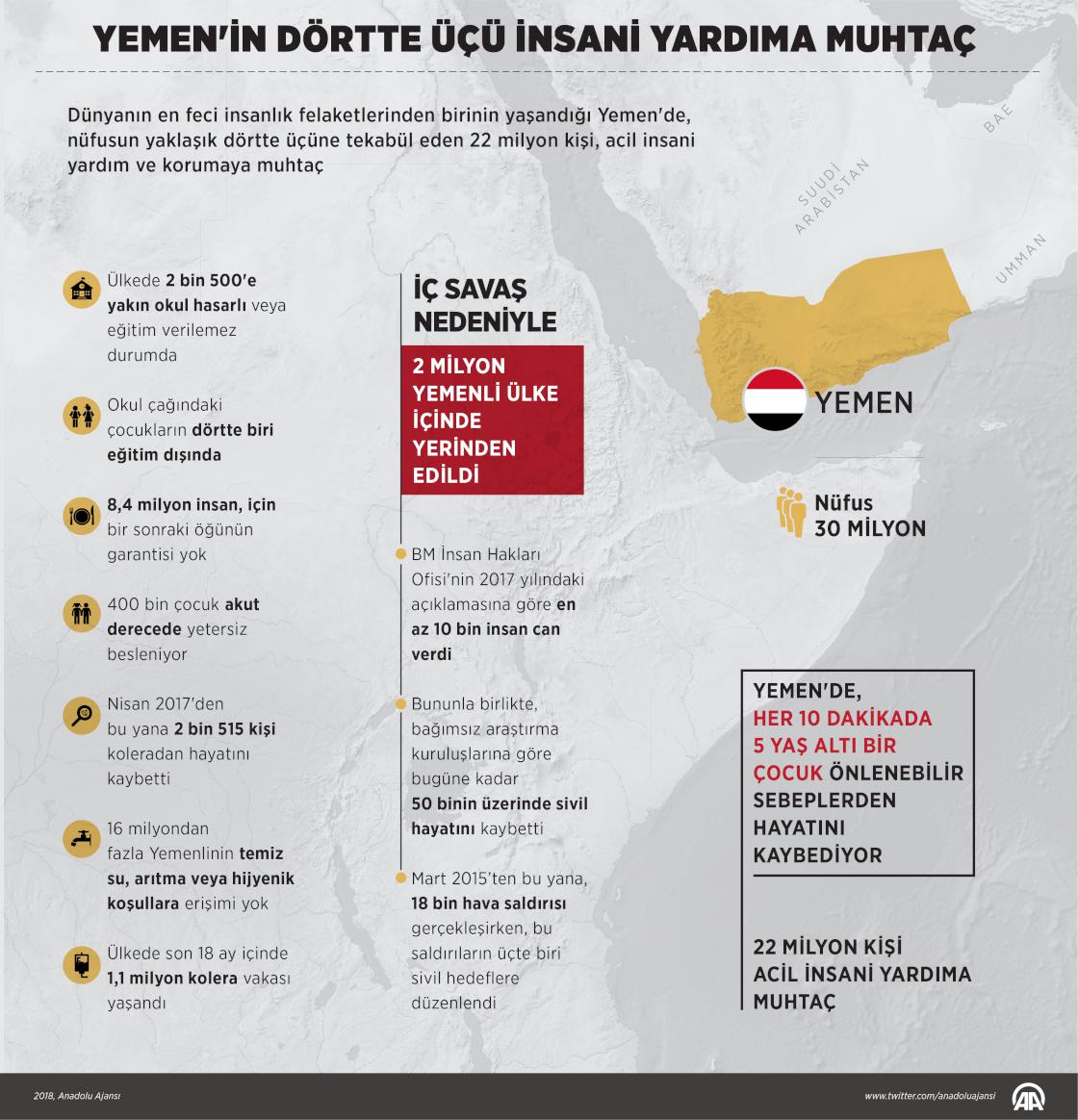 Dünyanın en feci insanlık felaketlerinden birinin yaşandığı Yemen'de, nüfusun yaklaşık dörtte üçüne tekabül eden 22 milyon insan, acil insani yardım ve korumaya muhtaç. ( Yasin Demirci - Anadolu Ajansı )
