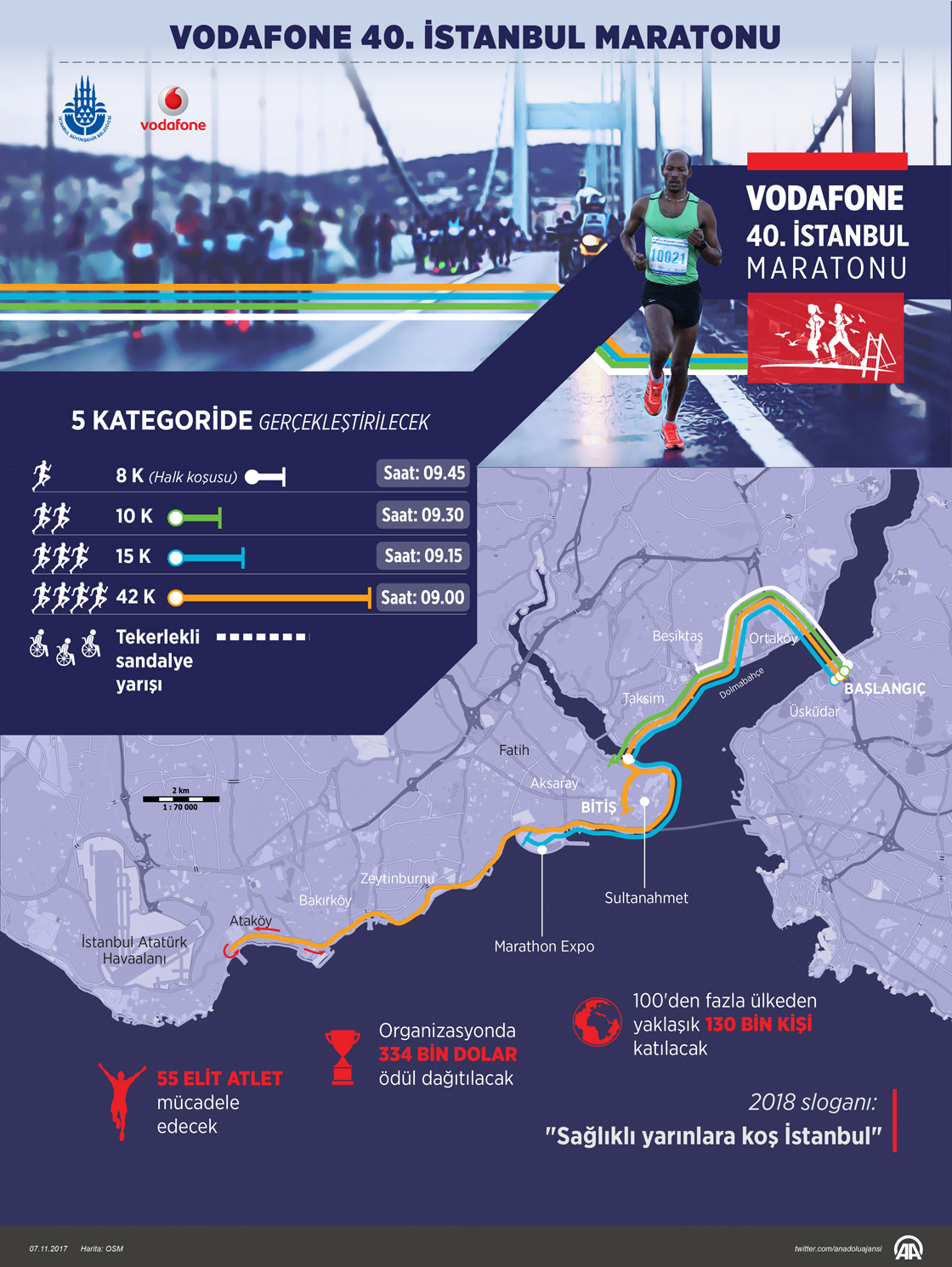 İstanbul Büyükşehir Belediyesi ve Spor İstanbul'un düzenlediği organizasyon, "Sağlıklı yarınlara koş İstanbul" sloganıyla 5 kategoride gerçekleştirilecek. Maraton, 15 kilometre ve 10 kilometre koşulara yaklaşık 30 bin, 8 kilometrelik halk koşusuna ise 100 bine yakın kişi katılacak. Vodafone 40. İstanbul Maratonu'nda bu yıl 55 elit atlet mücadele edecek. ( Gözde Gültekinler - Anadolu Ajansı )10 Kasım 2018•Güncelleme: 10 Kasım 2018