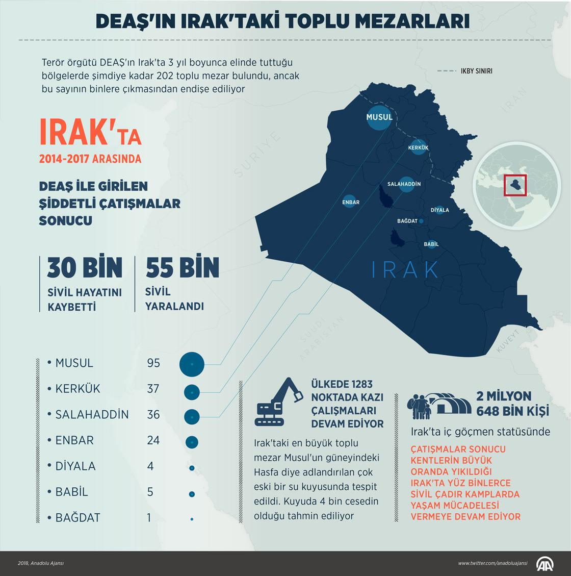 Terör örgütü DEAŞ'ın Irak'ta yaklaşık 3 yıl boyunca elinde tuttuğu bölgelerde şimdiye kadar 202 toplu mezar bulundu, ancak bu sayının binlere çıkmasından endişe ediliyor. Irak'ın batısında ilk defa Ocak 2014'te boy gösteren DEAŞ, daha sonra 10 Haziran 2014'te ülkesinin ikinci büyük kenti Musul'u ele geçirdi. Örgüt, Musul'dan sonra Salahaddin ve Enbar vilayetlerinin tamamıyla Kerkük ve Diyala'nın bir kısmında da kontrolü sağladı. Birleşmiş Milletler (BM) verilerine göre, Irak'ta 2014-2017 yıllarında DEAŞ mensuplarıyla girilen çatışma ve şiddet olayları nedeniyle 30 bin sivil hayatını kaybetti, 55 bini ise yaralandı.