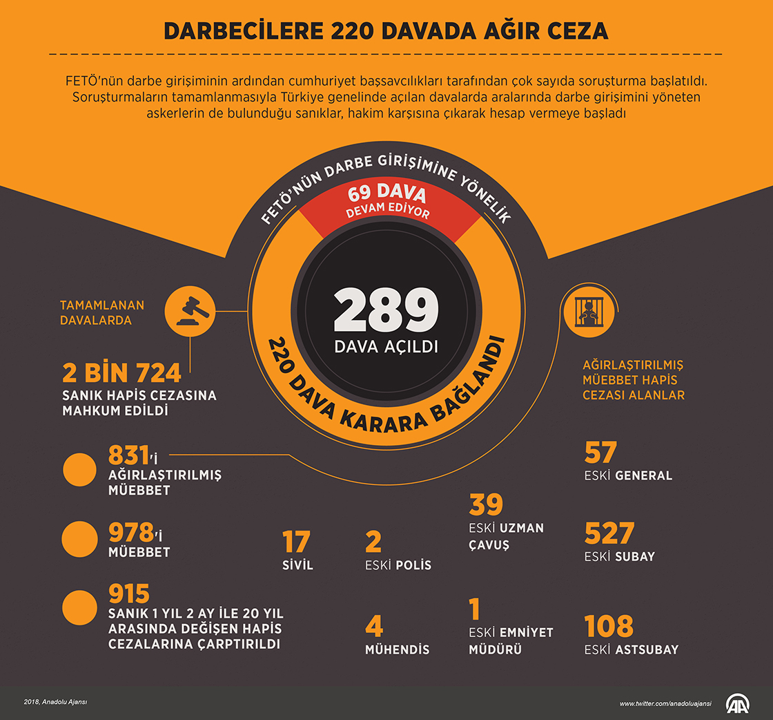 Fetullahçı Terör Örgütü'nün (FETÖ) 15 Temmuz 2016'daki darbe girişiminin ardından cumhuriyet başsavcılıkları tarafından çok sayıda soruşturma başlatıldı. Soruşturmaların tamamlanmasıyla Türkiye genelinde açılan davalarda, aralarında darbe girişimini yöneten askerlerin de bulunduğu sanıklar, hakim karşısına çıkarak hesap vermeye başladı. ( Murat Usubaliev - Anadolu Ajansı )13 Kasım 2018•Güncelleme: 13 Kasım 2018
