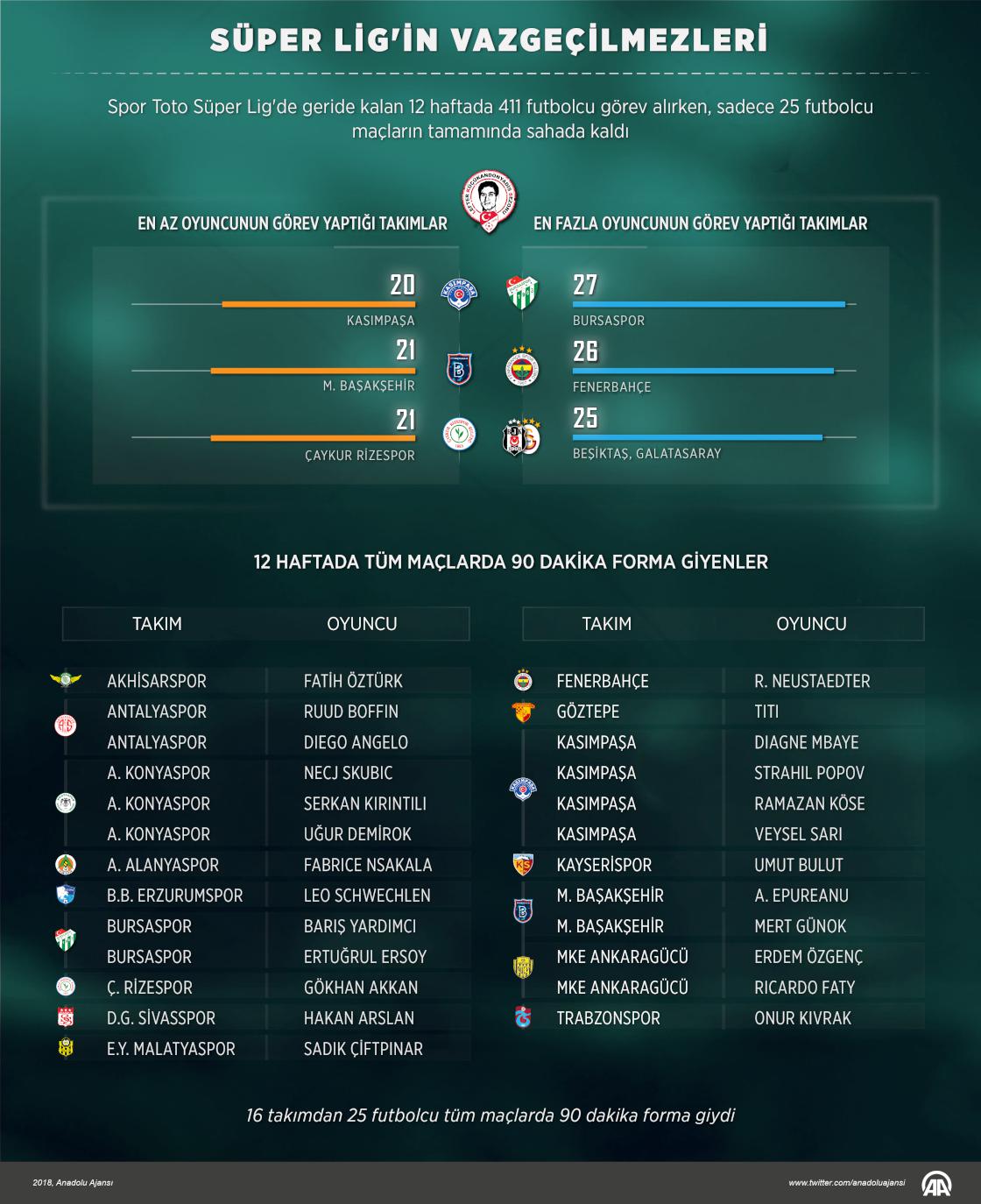 Spor Toto Süper Lig'in 12 haftalık bölümünde 16 takımdan 25 futbolcu tüm maçlarda 90 dakika forma giyerek, istikrarlı bir performans ortaya koydu. Ligin geride kalan bölümünde 411 futbolcu görev alırken, sadece 25 futbolcu maçların tamamında sahada kaldı.