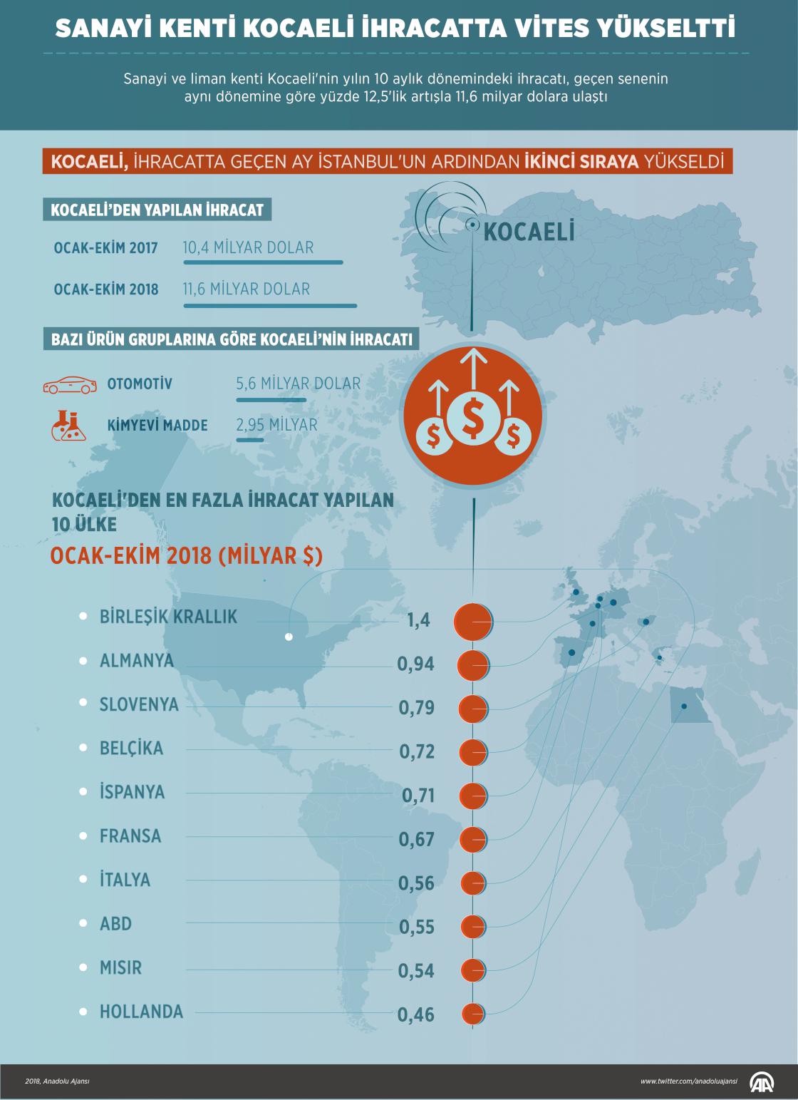 Türk sanayisinin merkez üssü Kocaeli'nin yılın 10 aylık dönemindeki ihracatı, geçen senenin aynı dönemine kıyasla yüzde 12,5 artarak 11,6 milyar dolar oldu. Türk imalat sanayisinin yaklaşık yüzde 15'ini barındıran Kocaeli, nüfus ve yüz ölçümü bakımından 81 il arasında alt sıralarda yer almasına rağmen sergilediği ticaret performansıyla Türkiye'yi dünyanın en büyük ihracat ülkelerinden biri haline getirme vizyonuna en güçlü katkı veren kentlerin başında geliyor. ( Gözde Gültekinler - Anadolu Ajansı )13 Kasım 2018•Güncelleme: 13 Kasım 2018