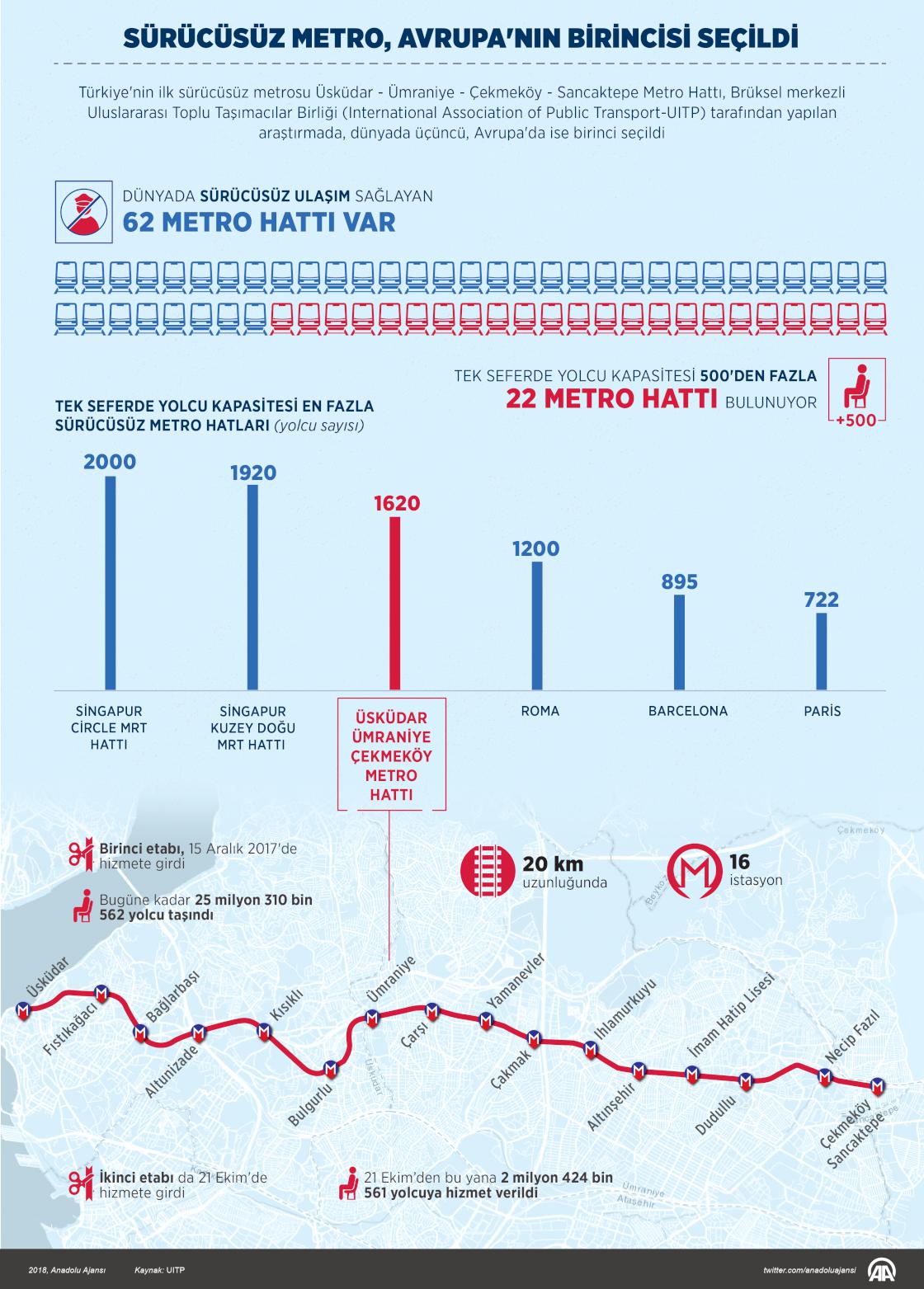 Türkiye'nin ilk sürücüsüz metrosu Üsküdar - Ümraniye - Çekmeköy - Sancaktepe Metro Hattı, Brüksel merkezli Uluslararası Toplu Taşımacılar Birliği (International Association of Public Transport-UITP) tarafından yapılan araştırmada, dünyada üçüncü, Avrupa'da ise birinci seçildi. ( Murat Usubaliev - Anadolu Ajansı )14 Kasım 2018•Güncelleme: 14 Kasım 2018
