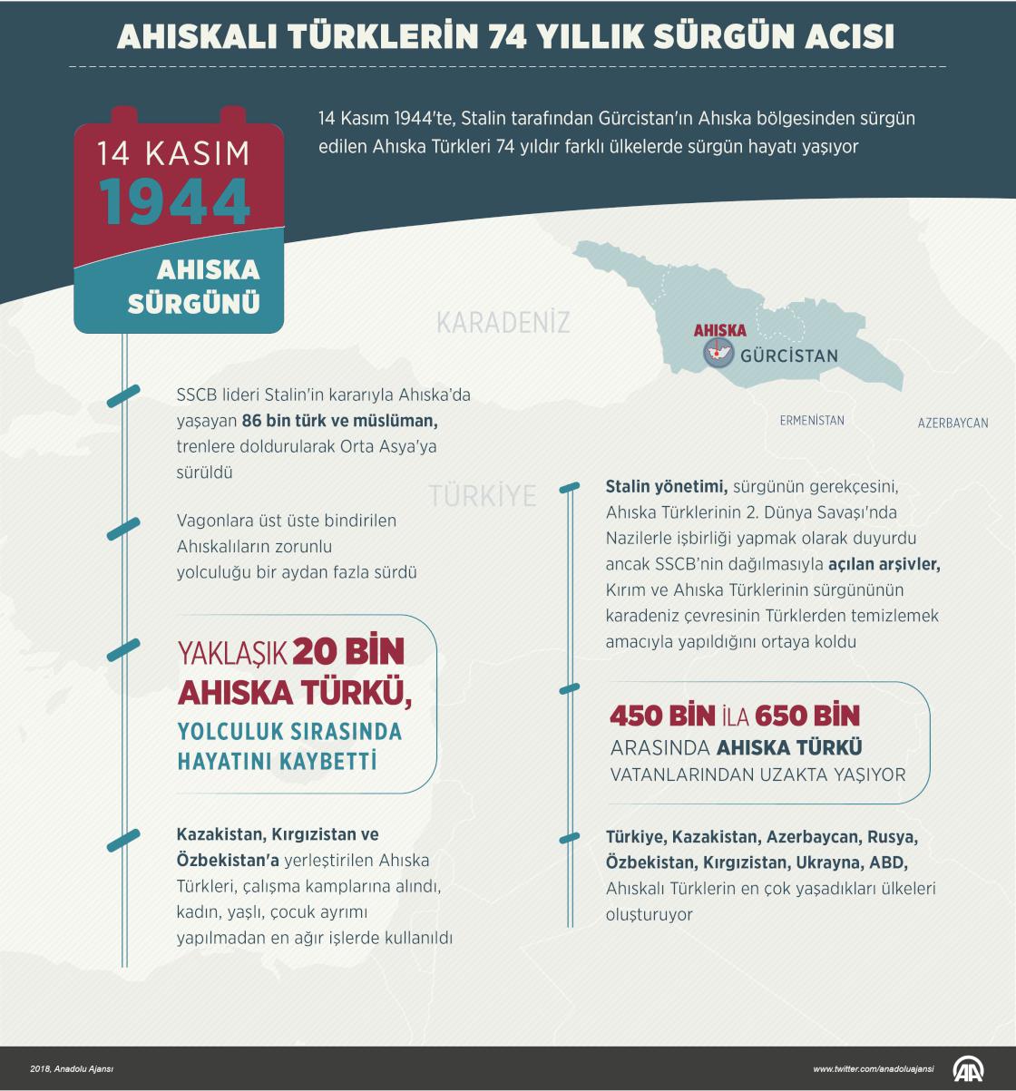 Sovyet Sosyalist Cumhuriyetler Birliği (SSCB) tarafından 74 yıl önce vatanlarından sürülen Ahıska Türkleri, anavatanlarına dönecekleri günü bekliyor. Gürcistan'ın Türkiye sınırında yer alan Ahıska, 1828-1829 Osmanlı-Rus savaşının ardından imzalanan antlaşmayla Rusya'ya bırakıldı. Bölge, 1. Dünya Savaşı'ndan sonra Sovyetler Birliği sınırları içinde kalan Gürcistan'a bağlandı. ( Gözde Gültekinler - Anadolu Ajansı )14 Kasım 2018•Güncelleme: 14 Kasım 2018