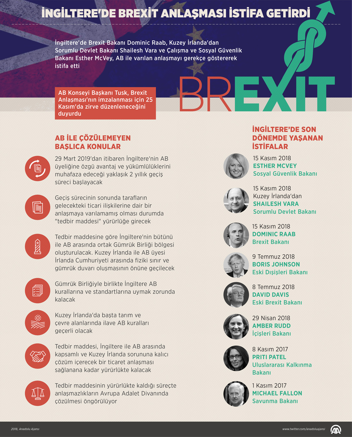 İngiltere'de Brexit Bakanı Dominic Raab ve Kuzey İrlanda'dan Sorumlu Devlet Bakanı Shailesh Vara Avrupa Birliği (AB) ile varılan Brexit anlaşmasını gerekçe göstererek istifa etti.