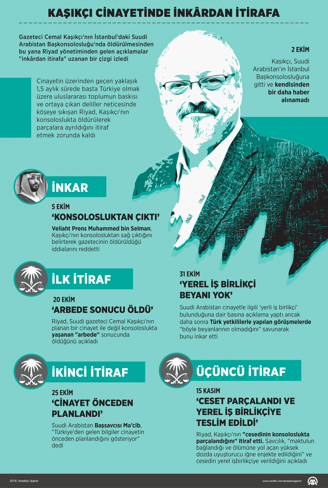 Gazeteci Cemal Kaşıkçı'nın İstanbul'daki Suudi Arabistan Başkonsolosluğu'nda öldürülmesinden bu yana Riyad yönetiminden gelen açıklamalar "inkârdan itirafa" uzanan bir çizgi izledi. Cinayetin üzerinden geçen yaklaşık 1,5 aylık sürede başta Türkiye olmak üzere uluslararası toplumun baskısı ve ortaya çıkan deliller neticesinde köşeye sıkışan Riyad, Kaşıkçı'nın konsoloslukta öldürülerek parçalara ayrıldığını itiraf etmek zorunda kaldı. ( Murat Usubaliev - Anadolu Ajansı )16 Kasım 2018•Güncelleme: 16 Kasım 2018