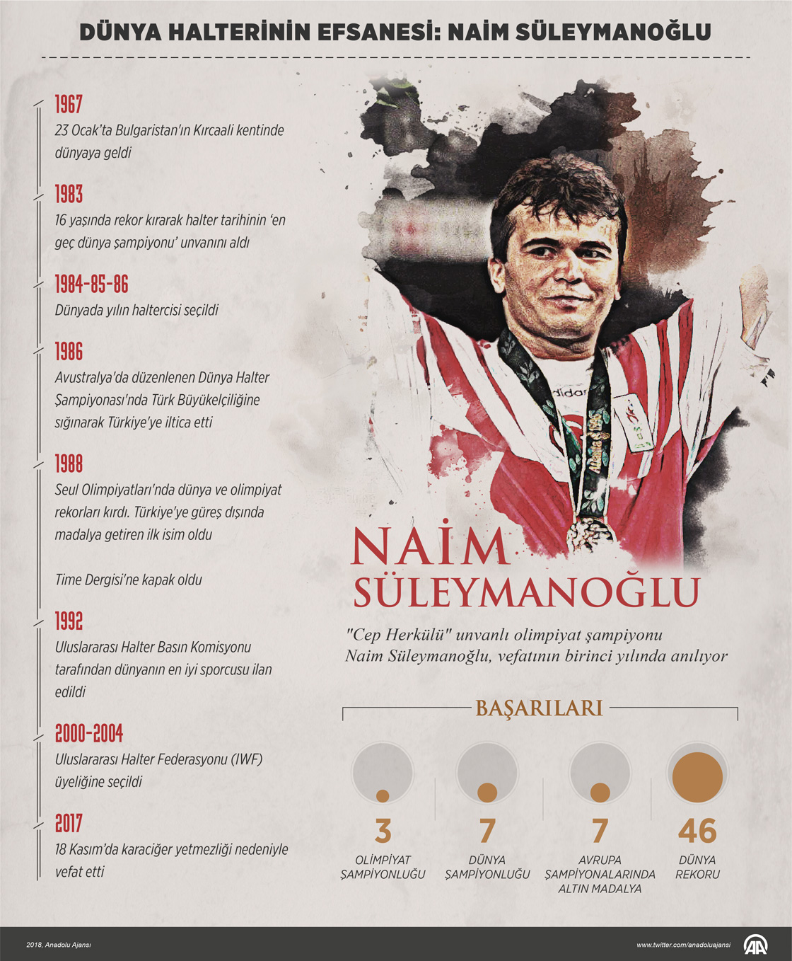 Küçük yaşta Bulgaristan'da başladığı halterde Türkiye'ye iltica ettikten sonra rekorları ve şampiyonluklarıyla dünyanın efsane sporcuları arasına adını yazdırmayı başaran "Cep Herkülü" Naim Süleymanoğlu, ölümünün birinci yıl dönümünde sevenlerince anılacak. Bulgaristan'ın Kırcaali kentinde, 23 Ocak 1967'de dünyaya gelen Süleymanoğlu, halterdeki muhteşem performansıyla tüm otoritelerin dikkatini çekerken, "Cep Herkülü" lakabını aldı. (Anadolu Ajansı - Kemal Delikmen)17 Kasım 2018•Güncelleme: 17 Kasım 2018