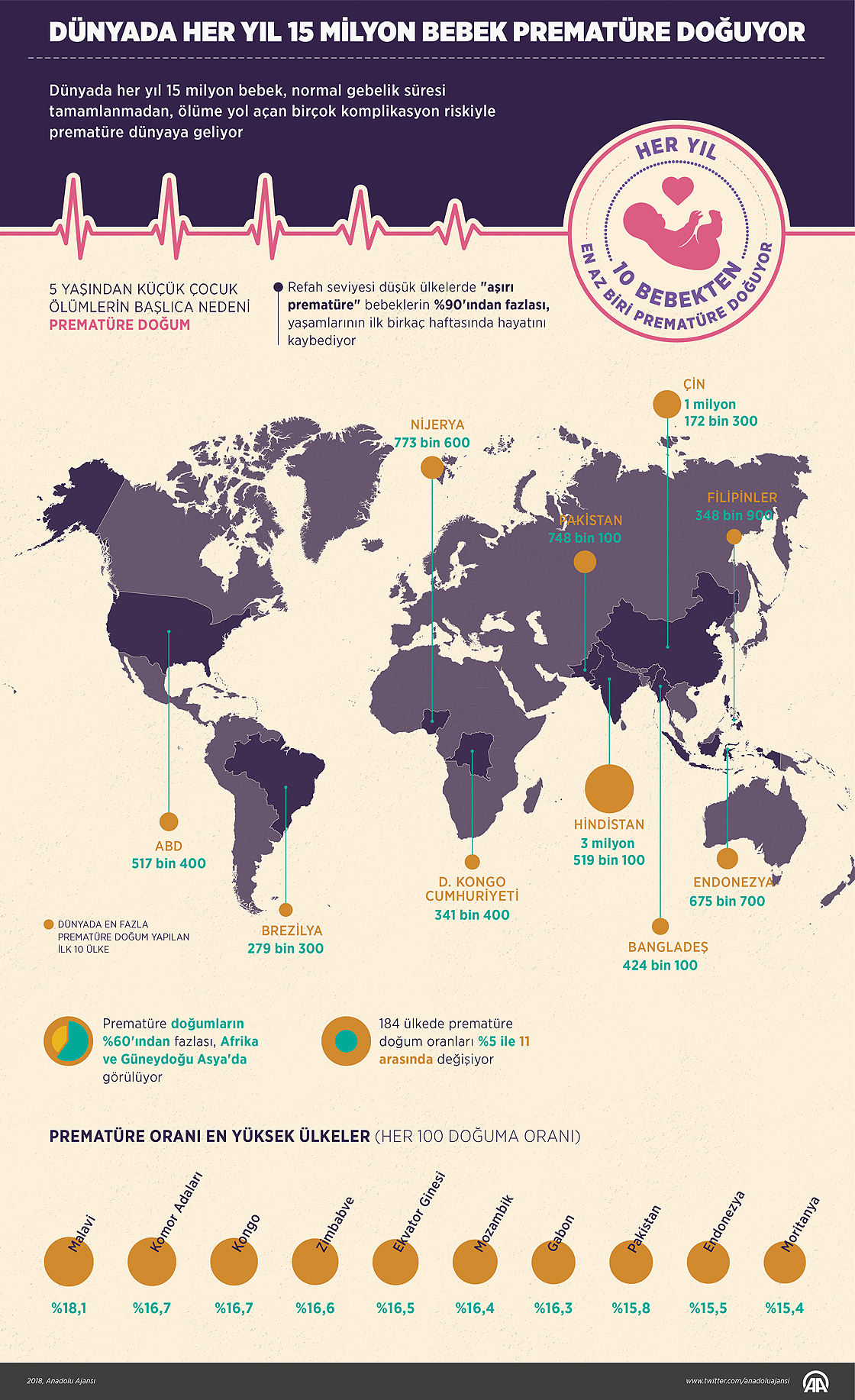 Dünyada her yıl 15 milyon bebek, normal gebelik süresi tamamlanmadan, ölüme yol açan birçok komplikasyon riskiyle prematüre dünyaya geliyor. 5 yaşından küçük çocuk ölümlerin başlıca nedeni prematüre doğum olduğu ifade ediliyor. Hayatta kalmayı başaran prematüre bebeklerin birçoğunda öğrenme bozuklukları, görsel ve işitsel problemler gibi yaşam boyu sürecek rahatsızlıklar görülüyor. (Yasin Demirci - Anadolu Ajansı)17 Kasım 2018•Güncelleme: 17 Kasım 2018