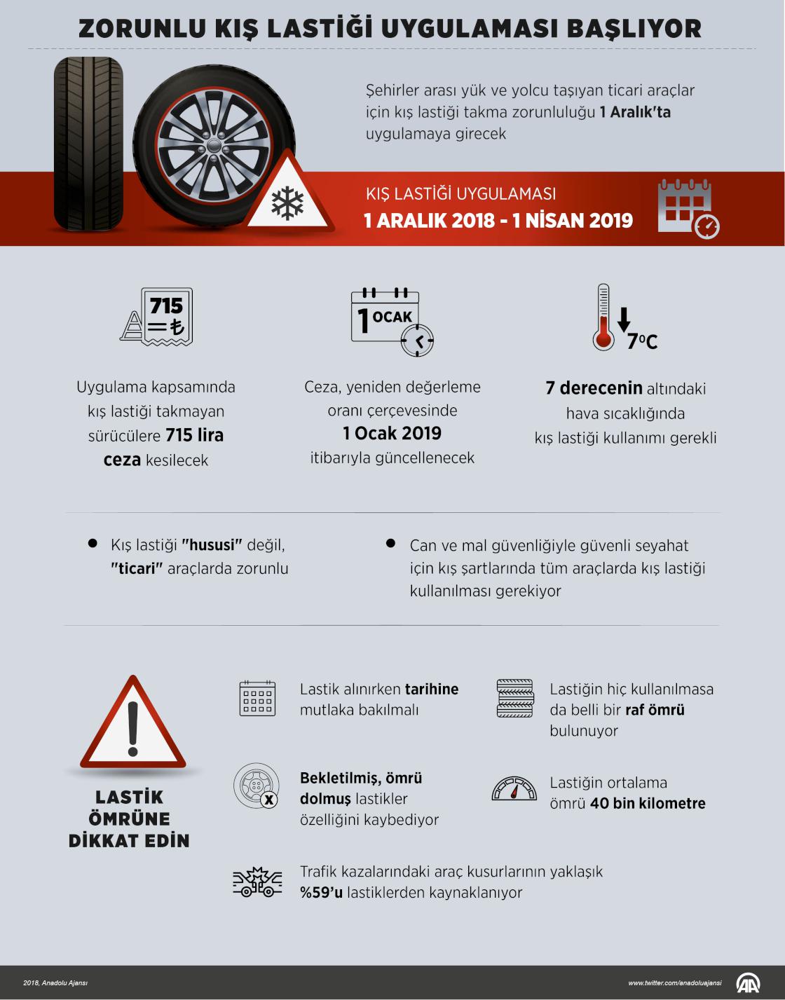 Şehirler arası yük ve yolcu taşıyan ticari araçlar için kış lastiği takma zorunluluğu 1 Aralık'ta uygulamaya girecek. Bu tarihten itibaren kış lastiği takmayan ticari araçların sürücülerine 715 lira para cezası kesilecek. Ulaştırma ve Altyapı Bakanlığınca, Karayolları Trafik Kanunu gereği yolcu ve eşya taşımalarında kullanılan araçların kış lastiği takmaları, illerin hava ve iklim şartlarına göre yılın belirli dönemi için zorunlu tutuluyor. Söz konusu yetki, Bakanlıkça valiliklere de devredilebiliyor. ( Gözde Gültekinler - Anadolu Ajansı )20 Kasım 2018•Güncelleme: 20 Kasım 2018