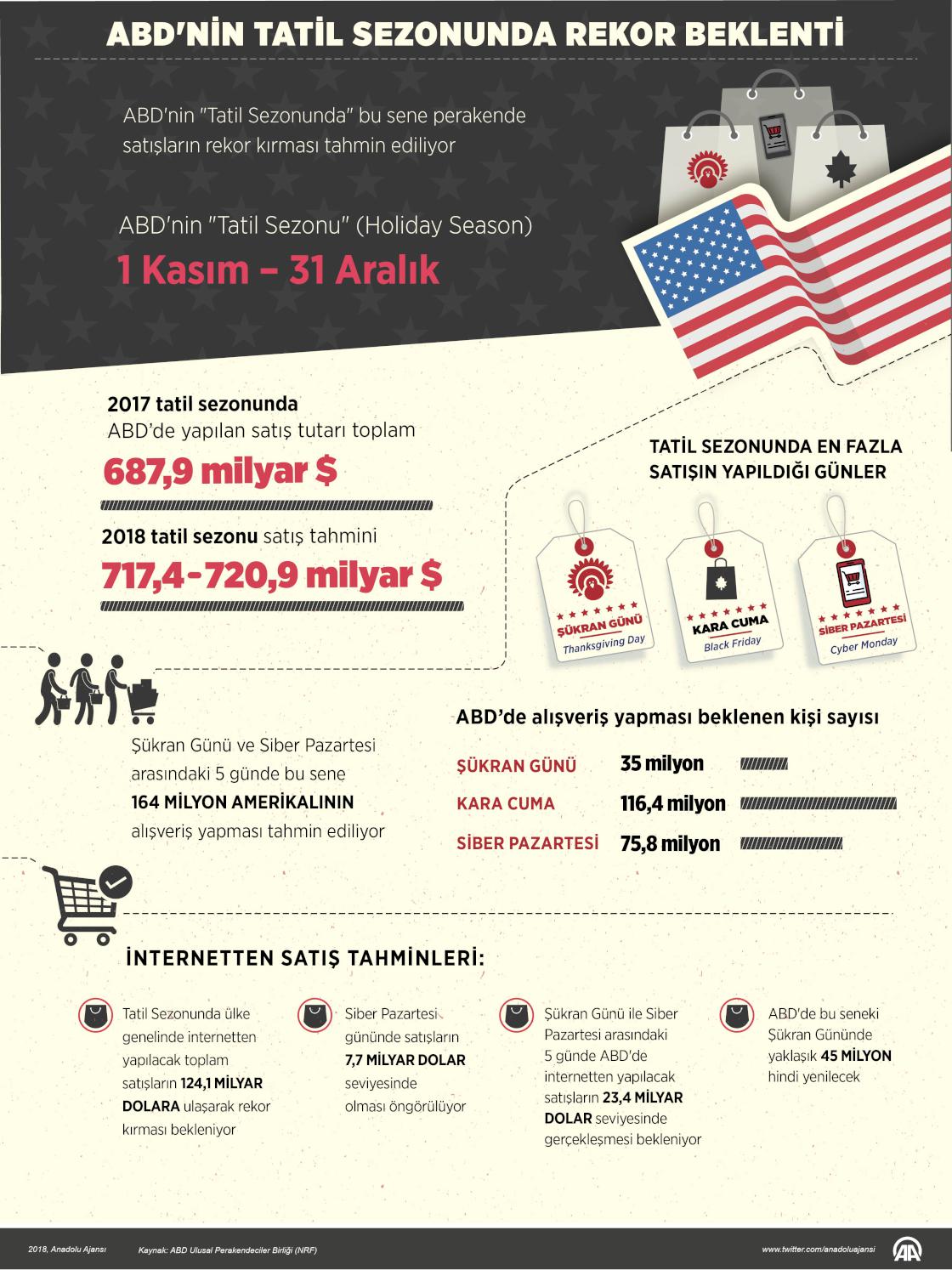 ABD'nin tatil sezonunda bu sene perakende satışların 717,4 ila 720,9 milyar dolar aralığına yükselerek rekor kıracağı tahmin ediliyor. Kara Cuma'da 116,4 milyon, Siber Pazartesi'de 75,8 milyon, Şükran Günü'nde ise 35 milyon Amerikalının internet ve mağazalardan alışveriş yapması öngörülüyor. Tatil sezonunda ülke genelinde internetten yapılacak toplam satışların bu sene 124,1 milyar dolara ulaşarak rekor kırması bekleniyor. Siber Pazartesi'de satışların 7,7 milyar dolar, Şükran Günü ile Siber Pazartesi arasında internetten yapılacak satışların ise 23,4 milyar dolar olması tahmin edilmekte. ( Gözde Gültekinler - Anadolu Ajansı )21 Kasım 2018•Güncelleme: 21 Kasım 2018