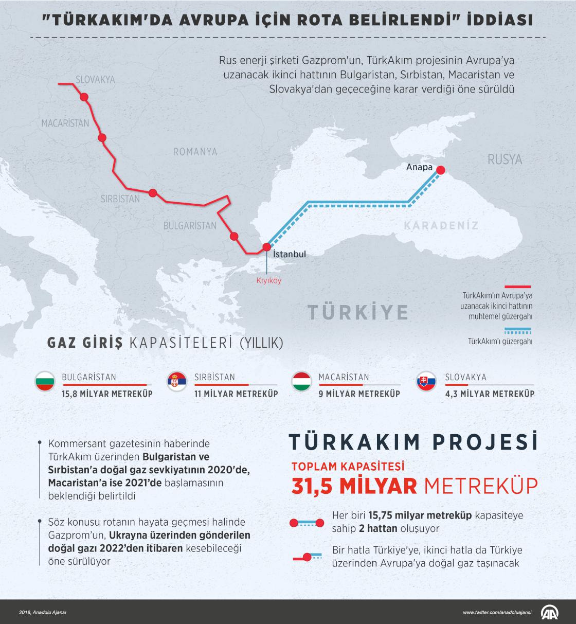 Rus enerji şirketi Gazprom'un, TürkAkım projesinin Avrupa’ya uzanacak hattının Bulgaristan, Sırbistan, Macaristan ve Slovakya'dan geçmesine karar verdiği öne sürüldü. Kommersant gazetesinin haberine göre, TürkAkım’ın Avrupa’ya uzanacak hattının geçeceği güzergah belirlendi. ( Kemal Delikmen - Anadolu Ajansı )22 Kasım 2018•Güncelleme: 22 Kasım 2018