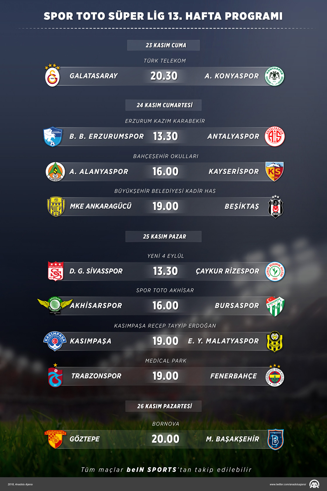 Spor Toto Süper Lig'de 13. haftanın açılış maçında bugün Galatasaray ile Atiker Konyaspor karşı karşıya gelecek. Ligde 24 Kasım Cumartesi 3, 25 Kasım Pazar günü 4, 26 Kasım Pazartesi günü 1 maç oynanacak.