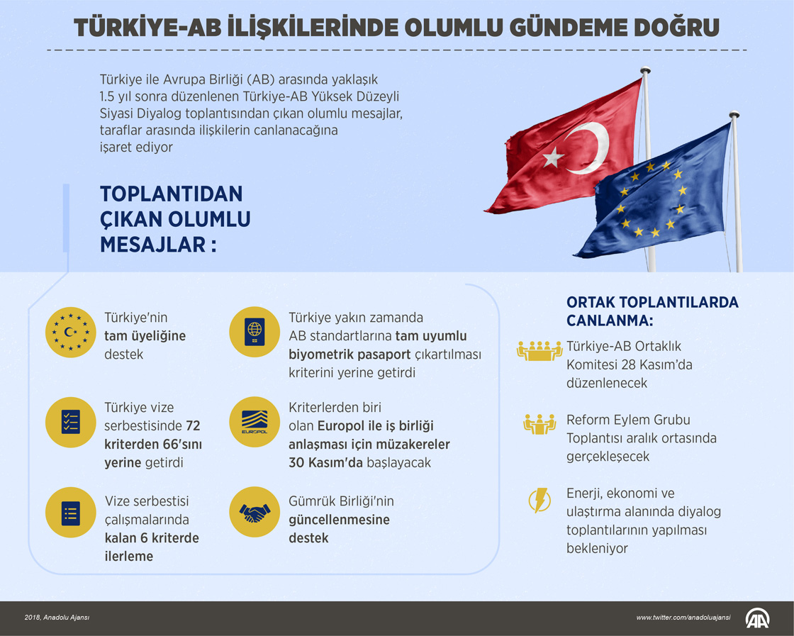 Türkiye ile Avrupa Birliği (AB) arasında yaklaşık 1,5 yılın ardından tekrar düzenlenen Yüksek Düzeyli Siyasi Diyalog toplantısından çıkan olumlu mesajlar, taraflar arasında ilişkilerin canlanacağına işaret ediyor. ( Yasin Demirci - Anadolu Ajansı )23 Kasım 2018•Güncelleme: 23 Kasım 2018