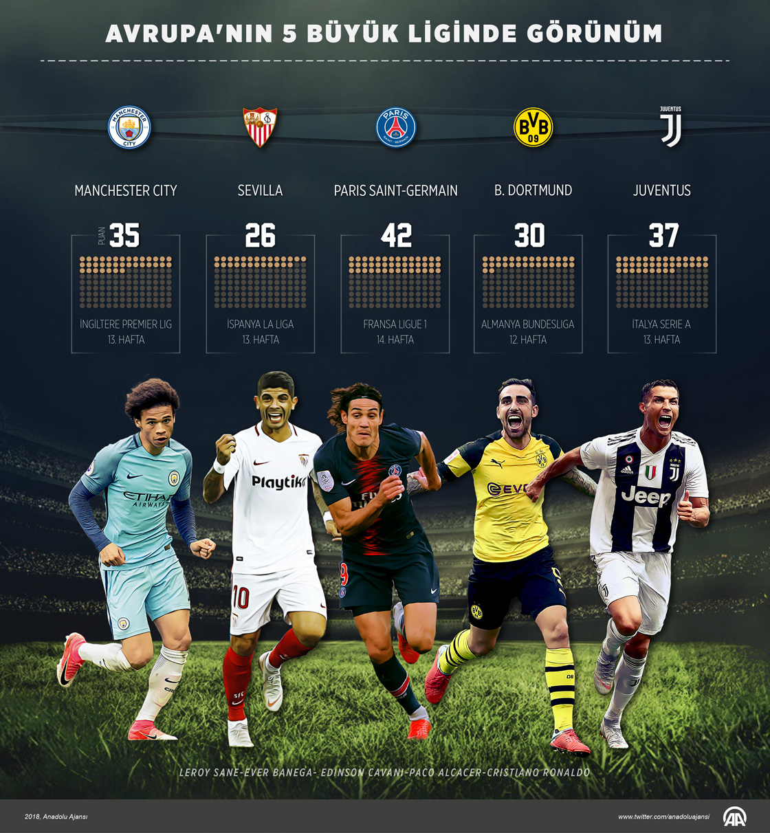 Avrupa'nın en büyük 5 futbol ligi kabul edilen İngiltere (Premier Lig), İspanya (La Liga), İtalya (Serie A), Almanya (Bundesliga) ve Fransa'daki (Ligue 1) karşılaşmalara, hafta sonu devam edildi. İngiltere'de Manchester City, İspanya'da Sevilla, İtalya'da Juventus, Almanya'da Borussia Dortmund, Fransa'da ise Paris Saint-Germain (PSG), puan tablosunun zirvesinde yer aldı. ( Muhammed Ali Yiğit - Anadolu Ajansı )26 Kasım 2018•Güncelleme: 26 Kasım 2018