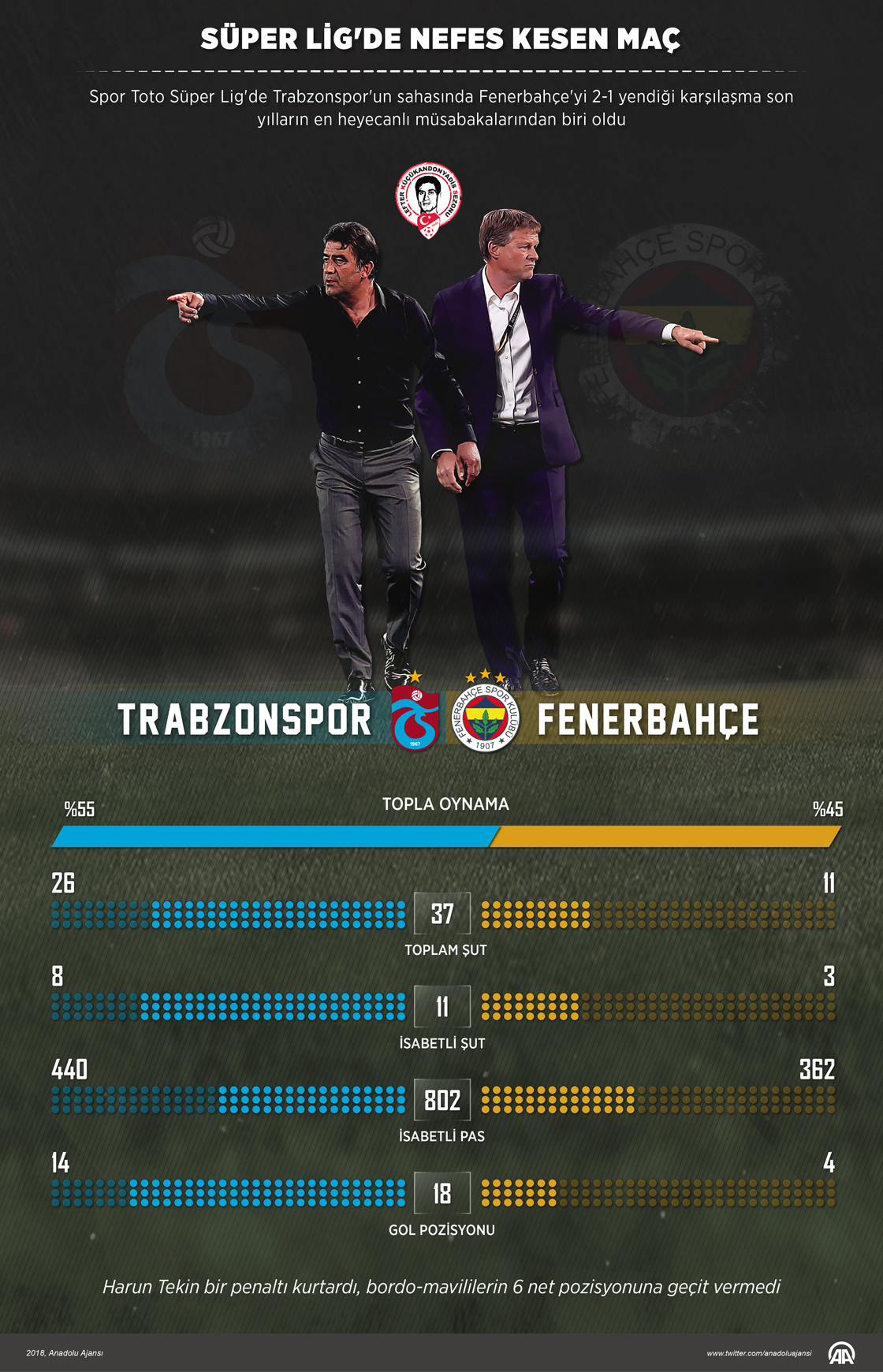 Spor Toto Süper Lig'de Trabzonspor'un sahasında Fenerbahçe'yi 2-1 yendiği karşılaşma son yılların en heyecanlı karşılaşmalarından biri oldu. ( Muhammed Ali Yiğit - Anadolu Ajansı )
