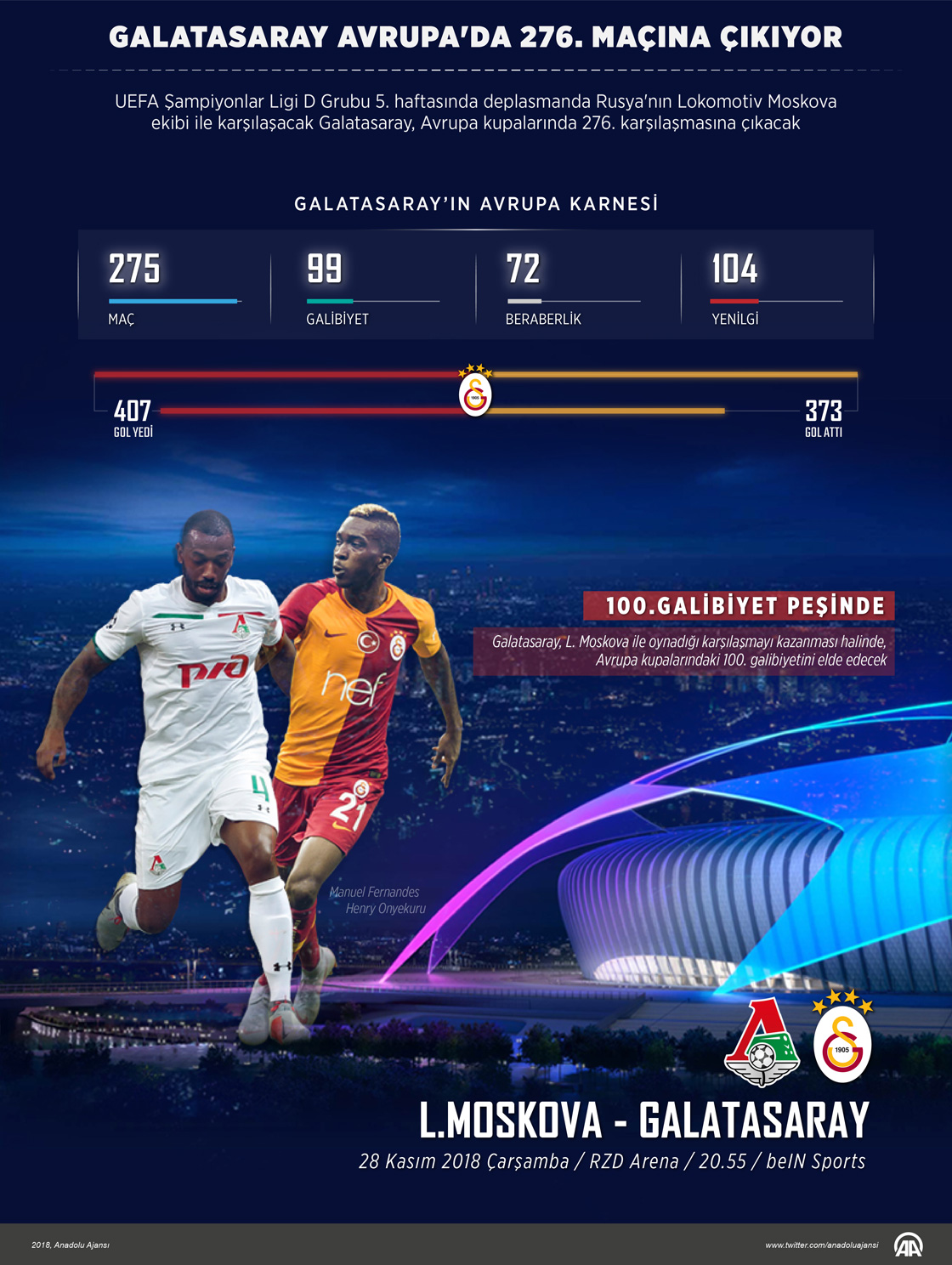 UEFA Şampiyonlar Ligi D Grubu 5. haftasında yarın Rusya'nın Lokomotiv Moskova ekibine konuk olacak Galatasaray, Avrupa kupalarında 276. maçına çıkacak. Sarı-kırmızılı takım, Avrupa kupalarında daha önce yaptığı 275 müsabakanın 99'undan galibiyetle ayrıldı. 104 karşılaşmada rakiplerine mağlup olan Galatasaray, 72 mücadeleyi ise beraberlikle tamamladı. ( Kemal Delikmen - Anadolu Ajansı )27 Kasım 2018•Güncelleme: 27 Kasım 2018