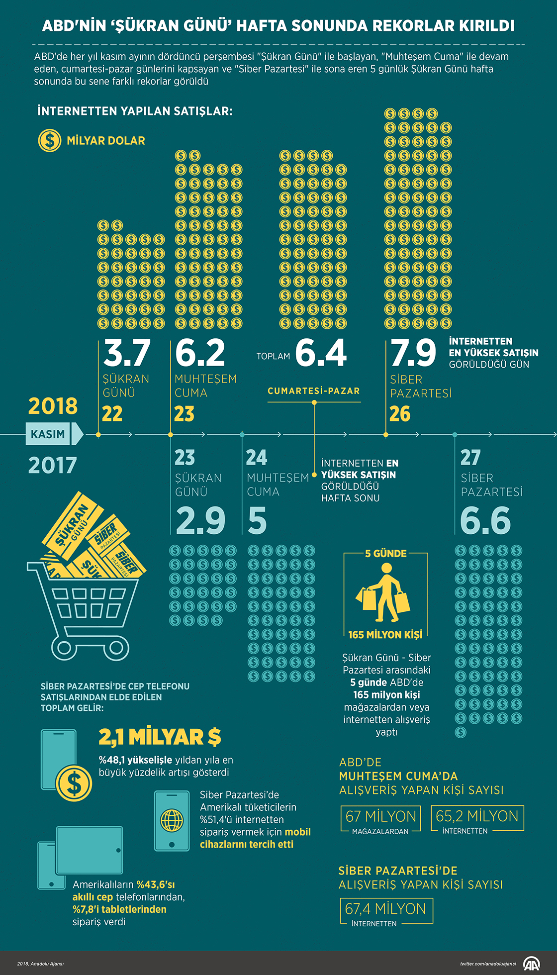 ABD'de her yıl kasım ayının dördüncü perşembesi Şükran Günü ile başlayan, Türkiye'de "Muhteşem Cuma" olarak nitelendirilen Black Friday ile devam eden, cumartesi-pazar günlerini kapsayan ve "Siber Pazartesi" (Cyber Monday) ile sona eren 5 günlük Şükran Günü hafta sonunda bu sene farklı rekorlar görüldü.29 Kasım 2018•Güncelleme: 29 Kasım 2018