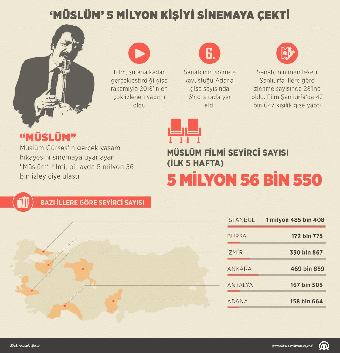 Müslüm Gürses'in gerçek yaşam hikayesini sinemaya uyarlayan "Müslüm" filmi, bir ayda 5 milyon 56 bin izleyiciye ulaştı. Film sanatçının şöhrete kavuştuğu Adana'da ise 158 bin 664 kişi tarafından izlendi.