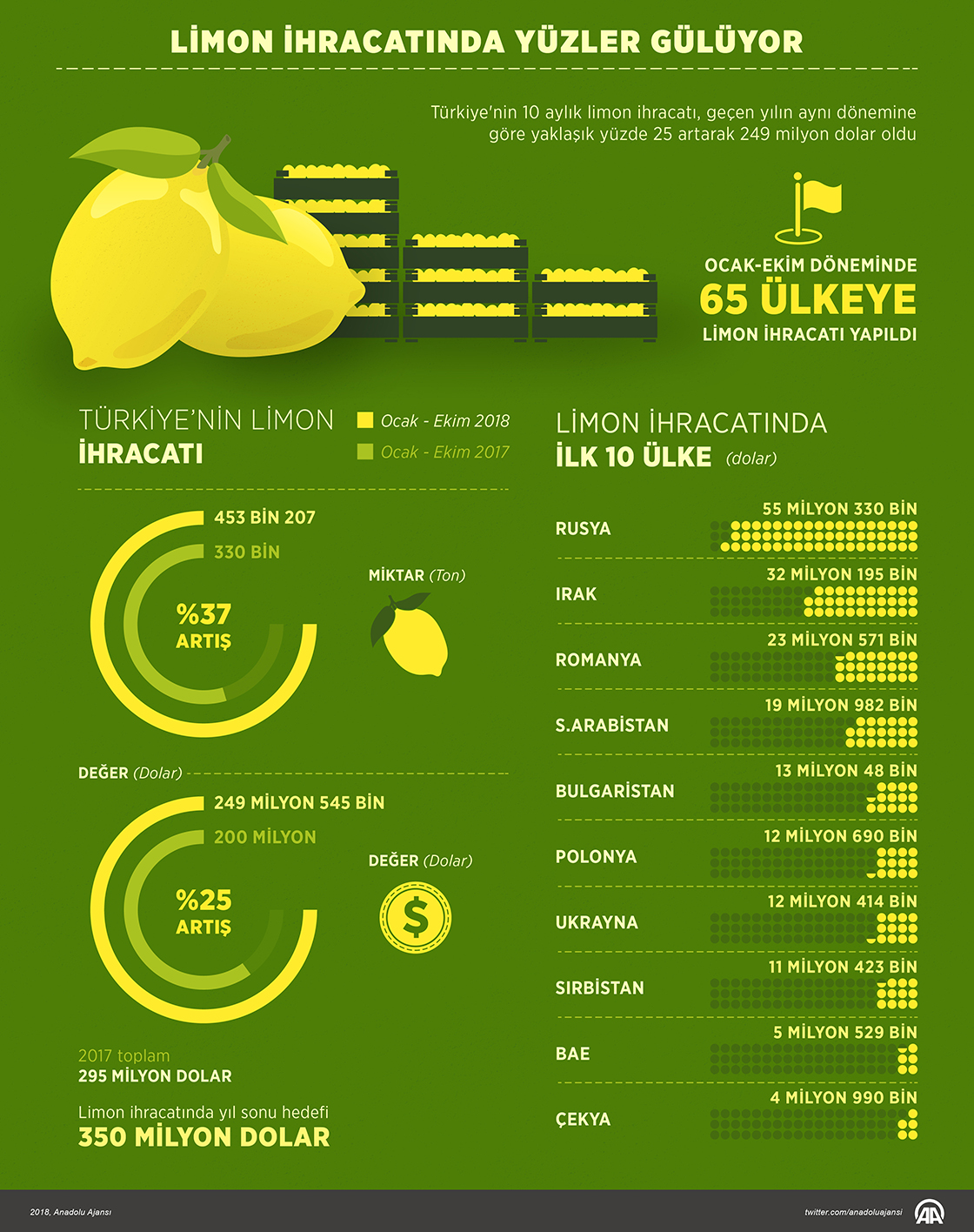 Ege İhracatçı Birlikleri verilerinden derlediği bilgiye göre, Türkiye'den 2017'de 295 milyon dolarlık limon ihracatı yapıldı.