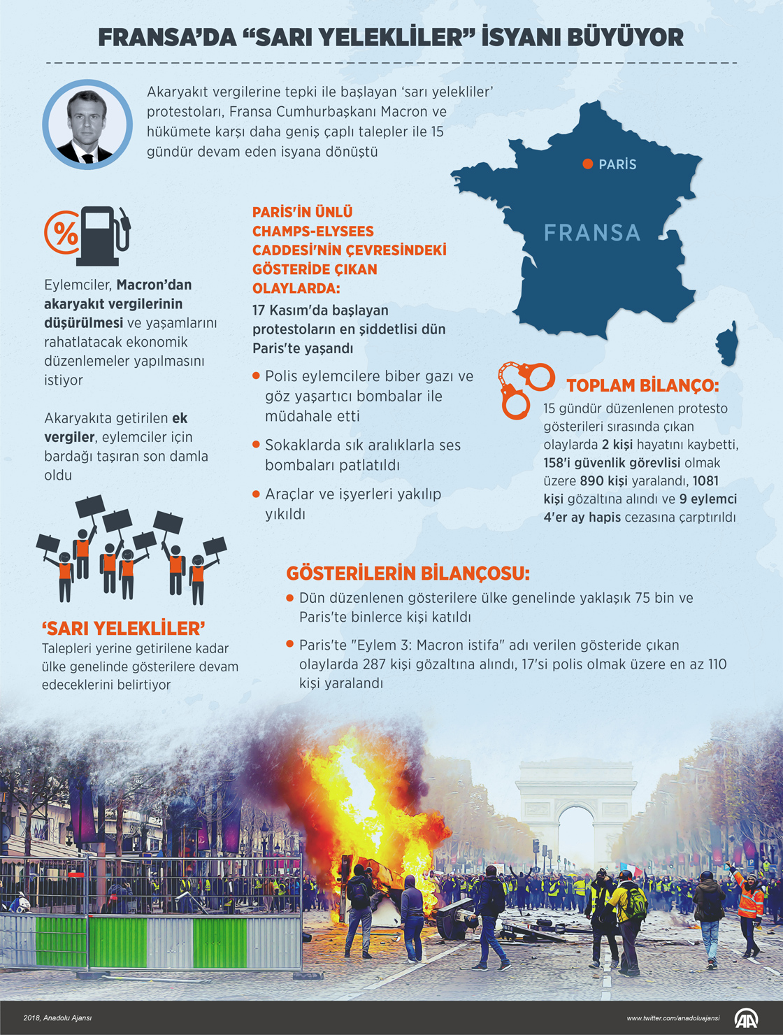 Fransa'da akaryakıt vergilerine tepkiyle başlayan sarı yeleklilerin protestoları, Cumhurbaşkanı Emmanuel Macron ve hükümete karşı daha geniş çaplı taleplerle 15 gündür devam eden isyana dönüştü. (Anadolu Ajansı - Muhammed Ali Yiğit)