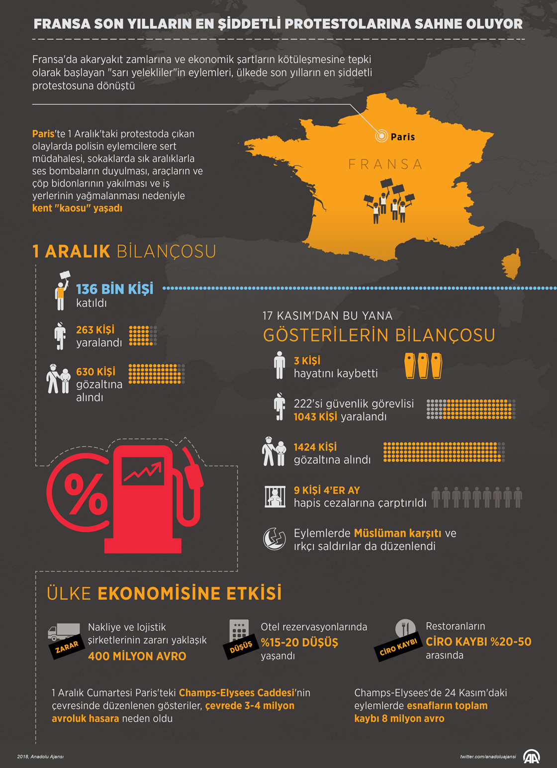 Fransa'da akaryakıt zamlarına ve ekonomik şartların kötüleşmesine tepki olarak başlayan "sarı yelekliler"in eylemleri, ülkede son yılların en şiddetli protestosuna dönüştü. Paris'te 1 Aralık'taki protestoda çıkan olaylarda polisin eylemcilere sert müdahalesi, sokaklarda sık aralıklarla ses bombaların duyulması, araçların ve çöp bidonların yakılması ve iş yerlerinin yağlamalanması nedeniyle kent "kaosu" yaşadı. ( Murat Usubaliev - Anadolu Ajansı )04 Aralık 2018•Güncelleme: 04 Aralık 2018