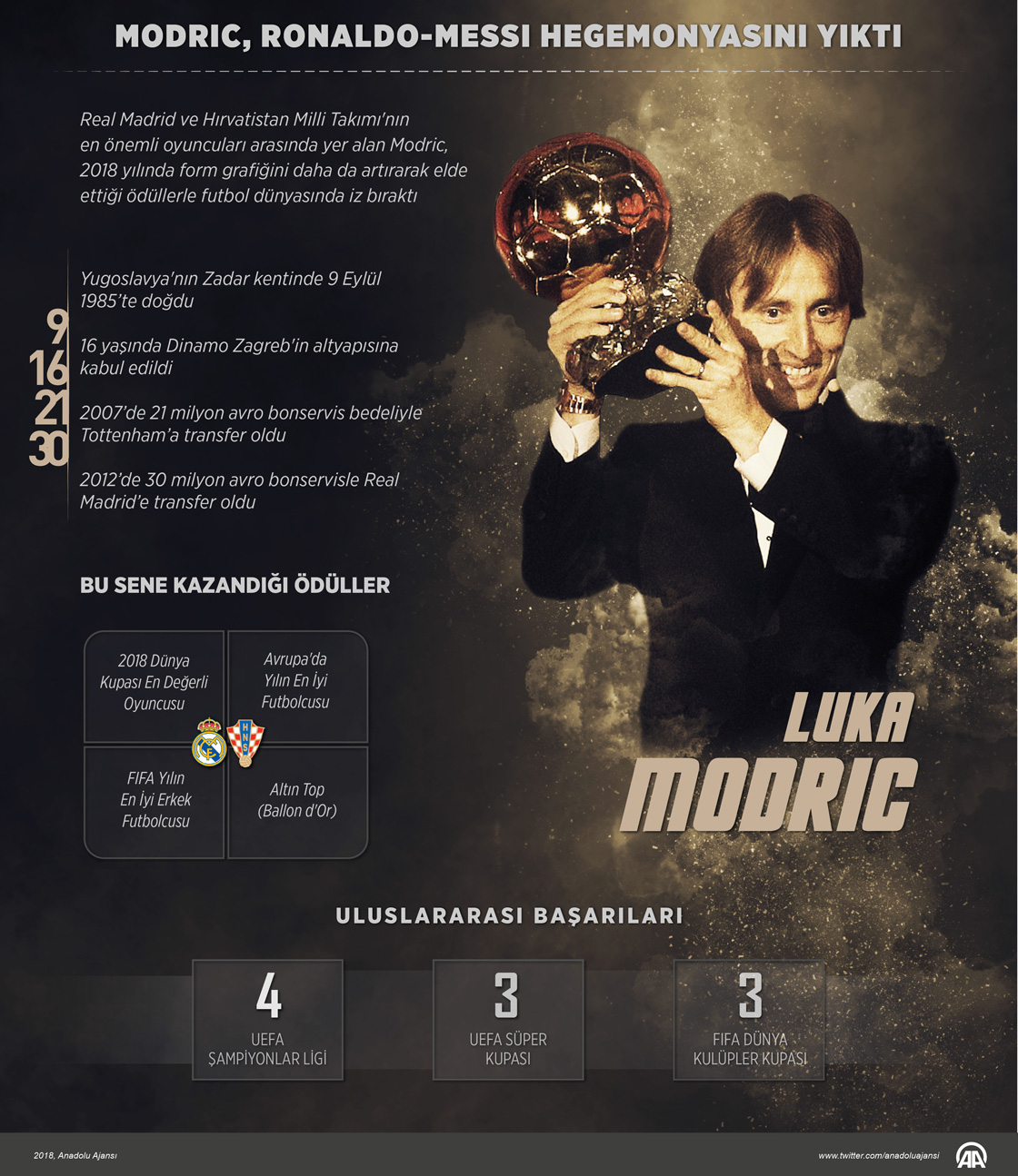 Hırvatistan'ın yetiştirdiği en yetenekli futbolcular arasında gösterilen FIFA Altın Top (Ballon d'Or) ödülünün sahibi Luka Modric, 2018 yılında kazandığı başarılarla adından sıkça söz ettirdi. İstikrarlı performansıyla uzun yıllar İspanya temsilcisi Real Madrid ve Hırvatistan Milli Takımı'nın en önemli oyuncuları arasında yer alan Modric, 2018'de form grafiğini daha da artırarak elde ettiği ödüllerle futbol dünyasında iz bıraktı. ( Kemal Delikmen - Anadolu Ajansı )04 Aralık 2018•Güncelleme: 04 Aralık 2018