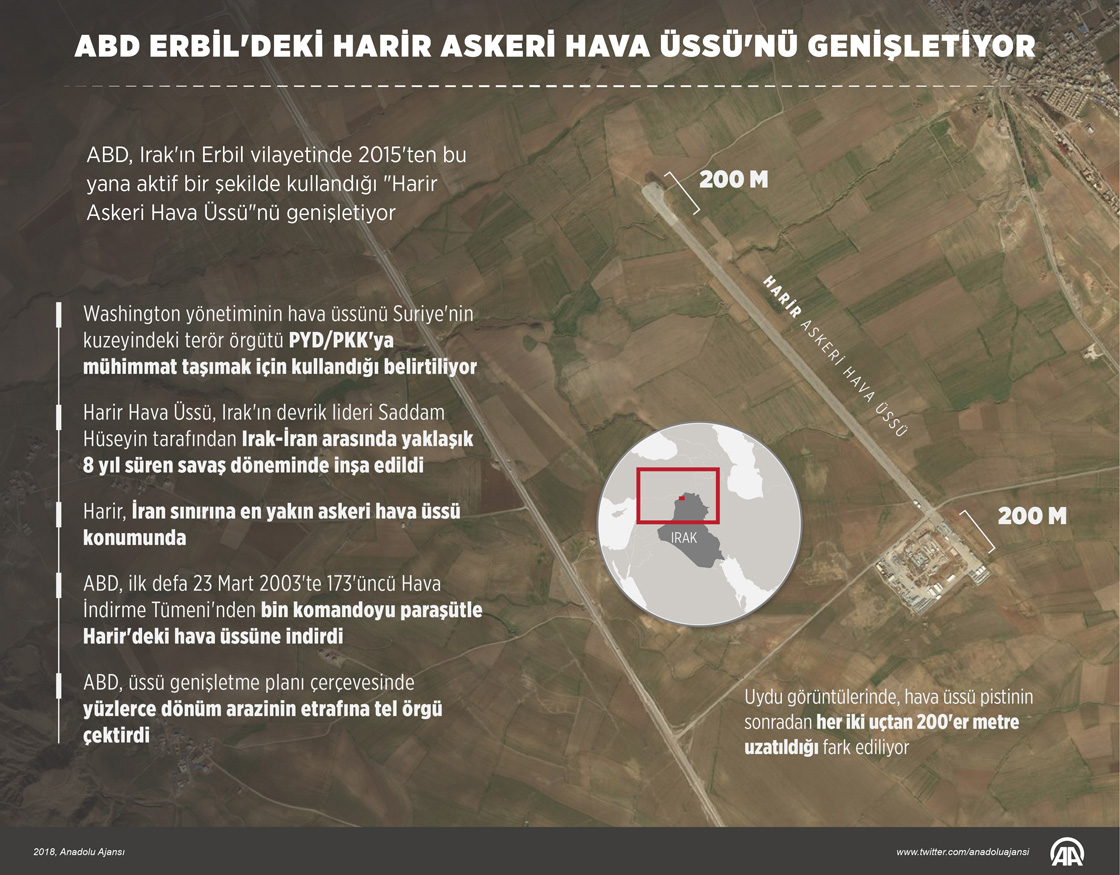 ABD, Irak'ın Erbil vilayetinde daha önce Baas Rejimi'ni yıkmak ve sonra da DEAŞ operasyonları için kullandığı "Harir Askeri Hava Üssü"nü genişletiyor. Washington yönetiminin, hava üssünü Suriye'deki terör örgütü PYD/PKK'ya mühimmat taşımak için de kullandığı belirtiliyor. ABD, Erbil kent merkezinden yaklaşık 65 kilometre mesafedeki askeri hava üssünün kapasitesini artırıp aktif hale getirmek için çalışmalar yürütüyor.