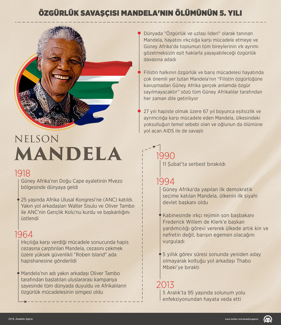 Güney Afrikalıların efsanevi lideri Nelson Mandela, ölümünün 5. yılında anılıyor. Mandela, Güney Afrika'nın ilk siyahi avukatı olarak başladığı siyasi yaşamında, ırkçılığa karşı aldığı tavır nedeniyle defalarca tutuklandı, 27 yıl hapis yattı. Mandela ülkesindeki ilk demokratik seçimle 1994'te ülkenin ilk siyahi devlet başkanı oldu. Güney Afrikalı lider, 5 Aralık 2013'te 95 yaşında solunum yolu enfeksiyonundan yaşama veda etti.
