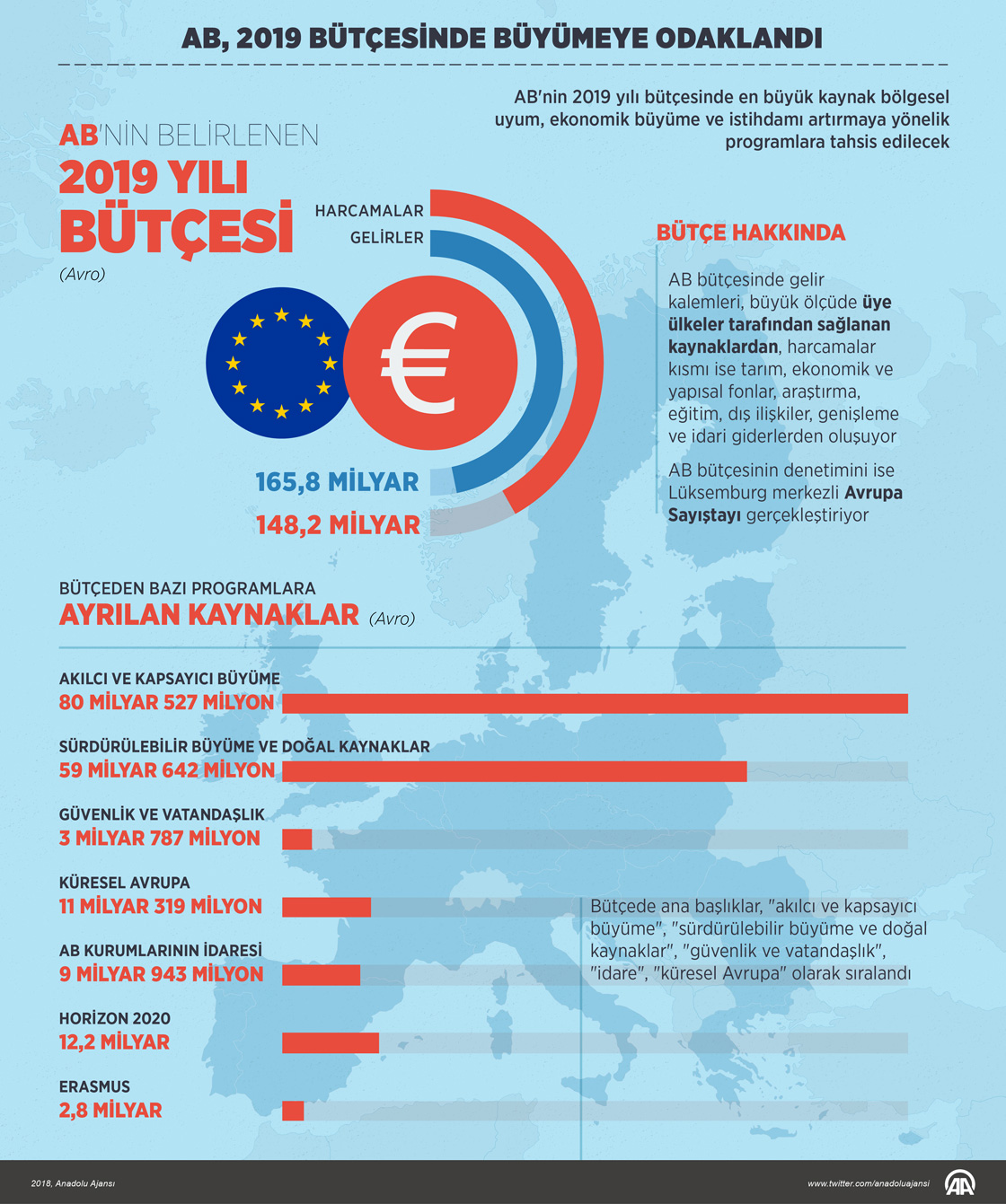 Avrupa Birliği'nin (AB) 2019 yılı genel bütçesinde en büyük kaynak, ekonomik, sosyal ve bölgesel uyum programlarıyla büyüme ve istihdamı artırmaya aktarılacak. AB'nin 2019 bütçesine ilişkin Avrupa Parlamentosu (AP) ve AB Konseyi arasında yapılan müzakereler sonucunda uzlaşı sağlandı ve AB'nin gelecek yıl bütçesinde gelirler 165,8 milyar avro, harcamalar ise 148,2 milyar avro olarak belirlendi. ( Murat Usubaliev - Anadolu Ajansı )06 Aralık 2018•Güncelleme: 06 Aralık 2018