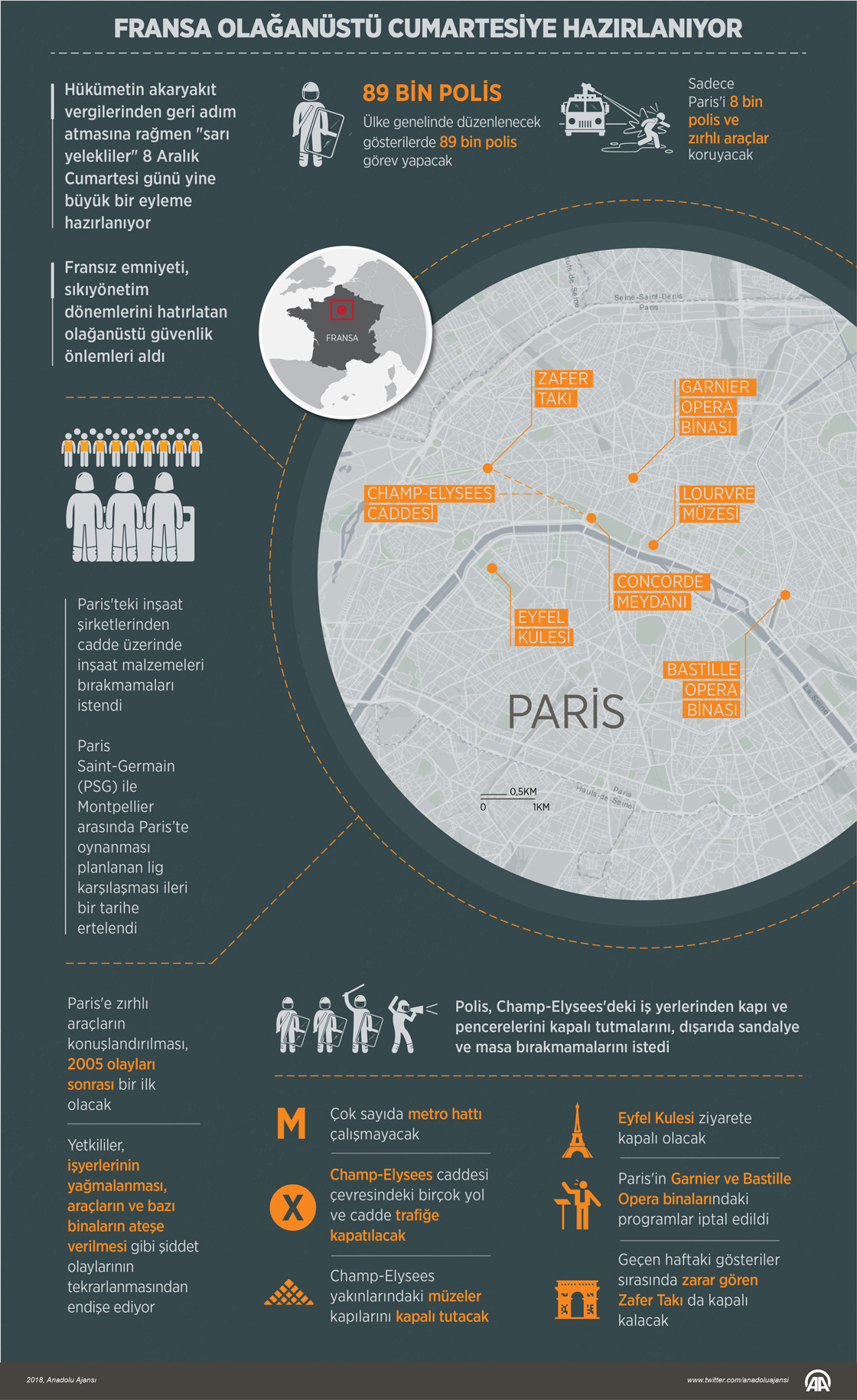 Fransa, "sarı yeleklilerin" ülke genelinde yarın düzenleyeceği gösteriler için teyakkuza geçti. Fransa Başbakanı Edouard Philippe, ülke genelinde 89 bin polisin görev alacağını, Paris'in zırhlı araçlarla korunacağını duyurdu. ( Ahmet Burak Özkan - Anadolu Ajansı )07 Aralık 2018•Güncelleme: 07 Aralık 2018