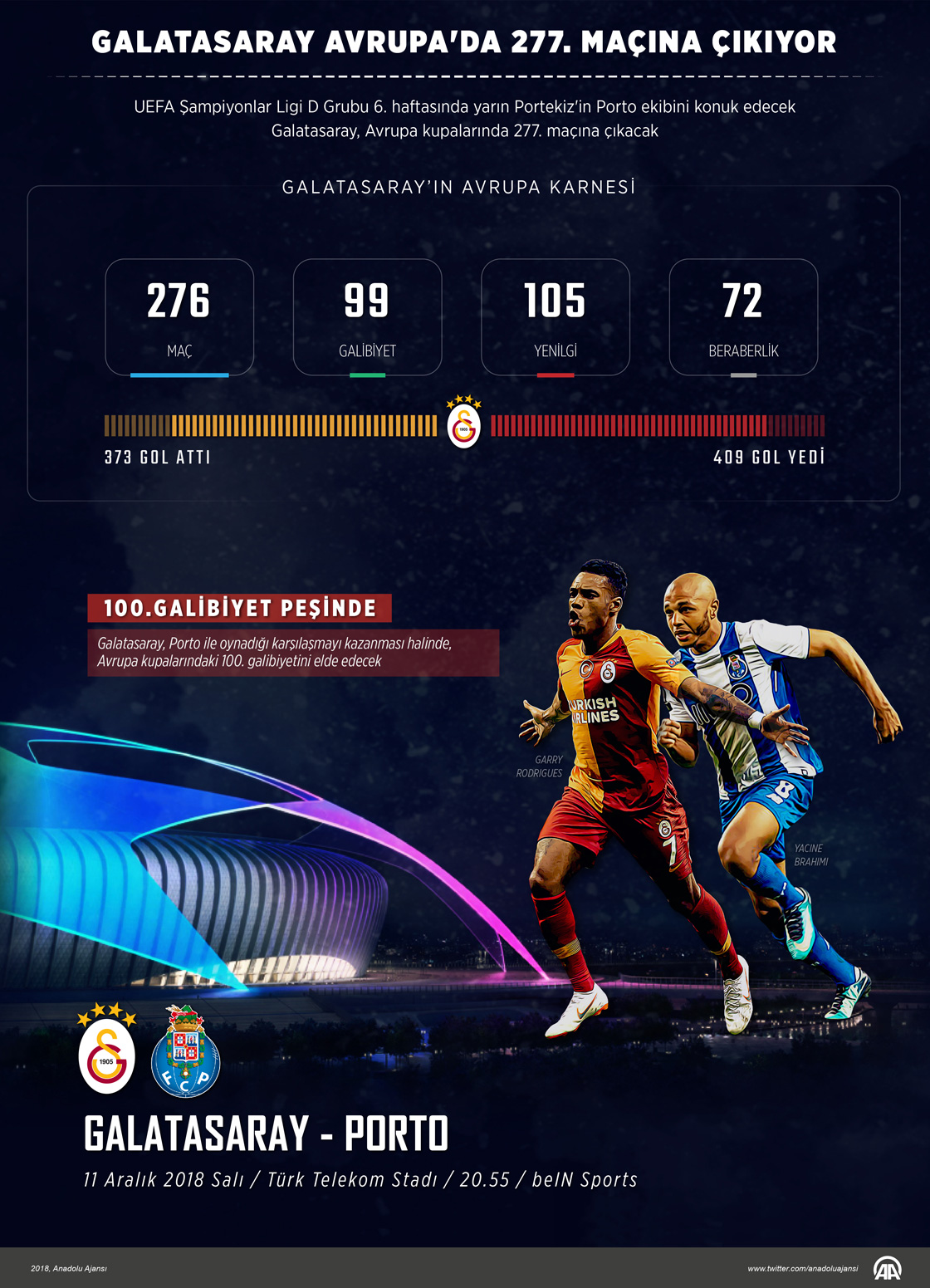 UEFA Şampiyonlar Ligi D Grubu 6. haftasında yarın Portekiz'in Porto ekibini konuk edecek Galatasaray, Avrupa kupalarında 277. maçına çıkacak. Sarı-kırmızılı takım, Avrupa kupalarında daha önce yaptığı 276 müsabakanın 99'undan galibiyetle ayrıldı. 105 karşılaşmada rakiplerine mağlup olan Galatasaray, 72 mücadeleyi ise beraberlikle tamamladı. Avrupa arenasında rakip fileleri 373 kez havalandıran sarı-kırmızılılar, kalesinde ise 409 gole engel olamadı. Galatasaray, Porto ile oynadığı karşılaşmayı kazanması halinde, Avrupa kupalarındaki 100. galibiyetini elde edecek.