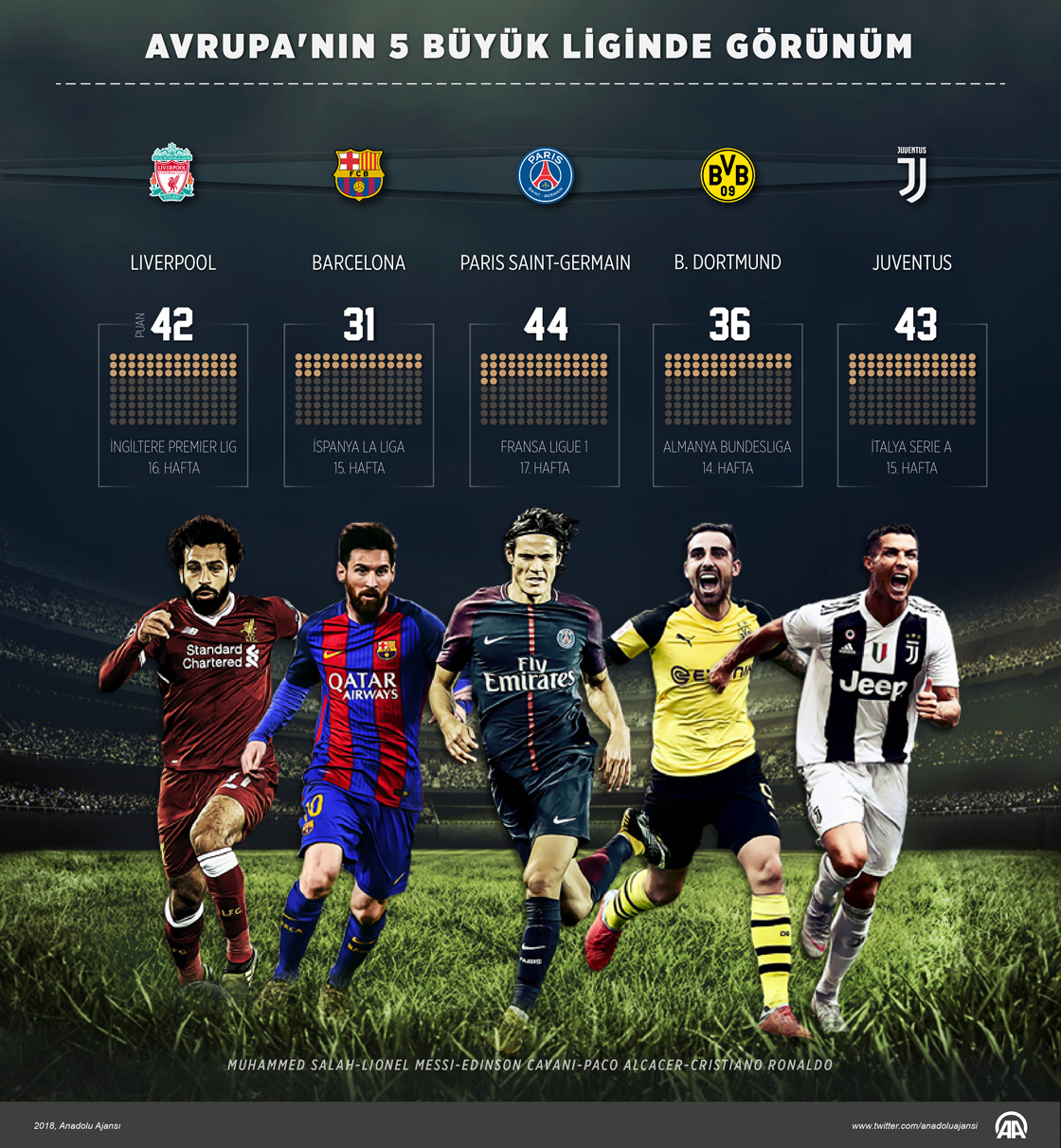Avrupa'nın en büyük 5 futbol ligi kabul edilen İngiltere (Premier Lig), İspanya (La Liga), İtalya (Serie A), Almanya (Bundesliga) ve Fransa'daki (Ligue 1) karşılaşmalara, hafta sonu devam edildi. İngiltere'de Liverpool, İspanya'da Barcelona, İtalya'da Juventus, Almanya'da Borussia Dortmund, Fransa'da ise Paris Saint-Germain (PSG), puan tablosunun zirvesinde yer aldı.