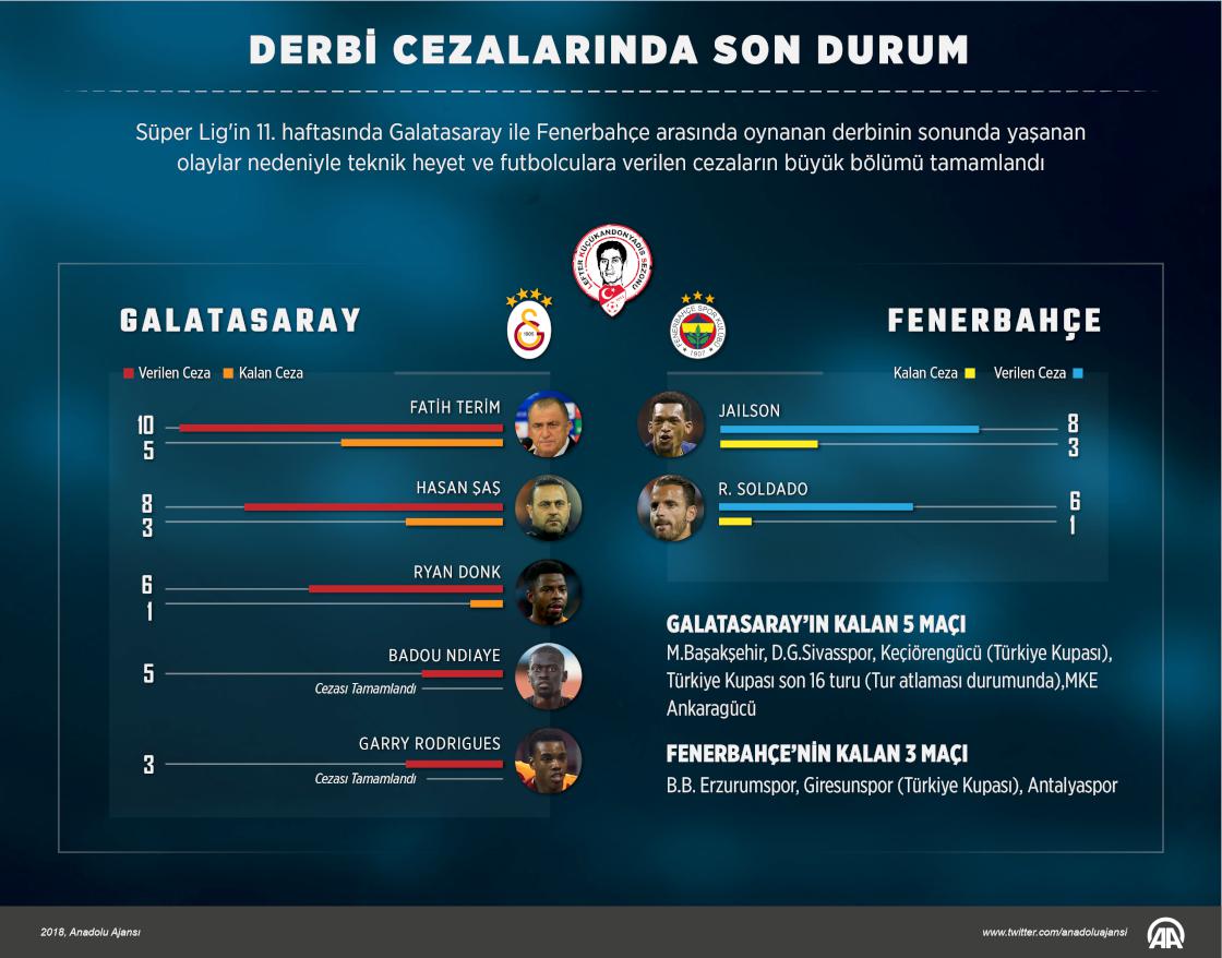 Spor Toto Süper Lig'in 11. haftasında Galatasaray ile Fenerbahçe arasında oynanan derbi maçın sonunda yaşanan olaylar nedeniyle teknik heyet ve futbolculara verilen cezaların büyük bölümü tamamlandı. ( Kemal Delikmen - Anadolu Ajansı )