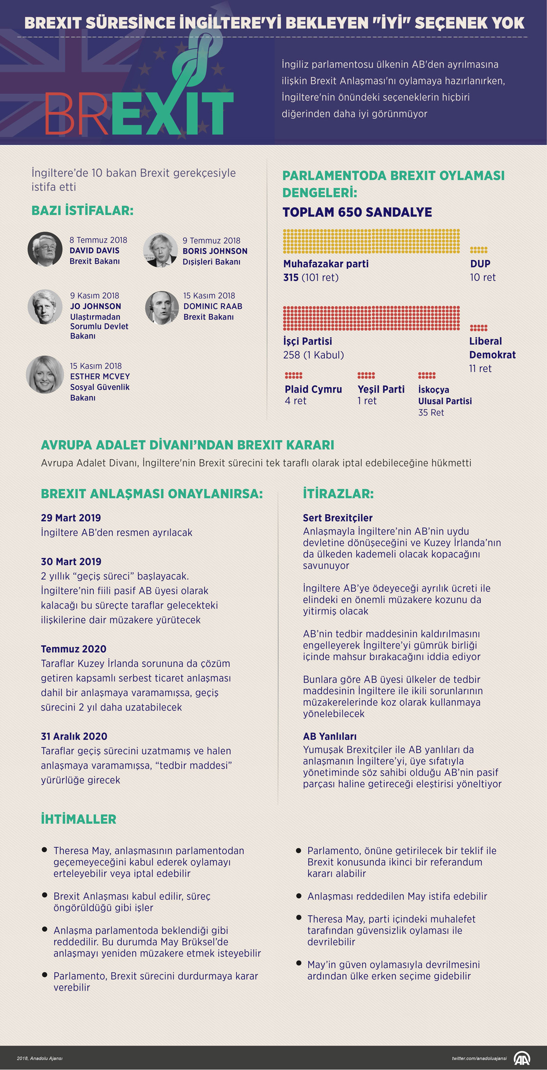İngiliz parlamentosu ülkenin AB'den ayrılmasına ilişkin Brexit Anlaşması'nı oylamaya hazırlanırken, İngiltere'nin önündeki seçeneklerin hiçbiri diğerinden daha iyi görünmüyor. İngiliz parlamentosu hükümetin Avrupa Birliği (AB) ile vardığı Brexit Anlaşması'nı yarın oylayacak. Ancak "Brexit Brexit'tir" sloganıyla yola çıkan Başbakan Theresa May'in 2 yıla yaklaşan müzakerelerin sonucunda elde ettiği anlaşma kimseyi memnun edemedi.