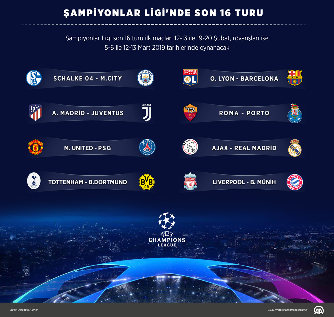 Son şampiyon İspanyol ekibi Real Madrid'in rakibi, Hollanda'nın Ajax takımı oldu. Atletico Madrid (İspanya)-Juventus (İtalya) ve Liverpool (İngiltere)-Bayern Münih (Almanya) eşleşmeleri de dikkati çekti. Şampiyonlar Ligi son 16 turu ilk maçları 12-13 ile 19-20 Şubat, rövanşları ise 5-6 ile 12-13 Mart 2019 tarihlerinde oynanacak. ( Kemal Delikmen - Anadolu Ajansı )17 Aralık 2018•Güncelleme: 17 Aralık 2018