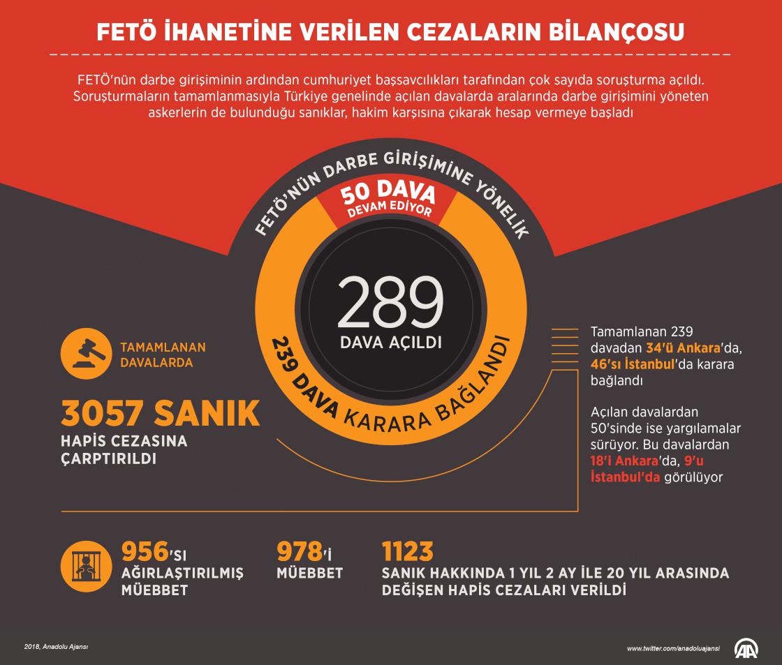 Fetullahçı Terör Örgütü'nün (FETÖ) 15 Temmuz 2016'daki darbe girişimine ilişkin açılan 289 davadan bugüne kadar tamamlanan 239'unda, bin 934'ü ömür boyu olmak üzere 3 bin 57 sanık hapis cezasına çarptırıldı. FETÖ'nün darbe girişiminin ardından cumhuriyet başsavcılıkları tarafından çok sayıda soruşturma açıldı. Soruşturmaların tamamlanmasıyla ülke genelinde açılan davalarda, aralarında darbe girişimini yöneten askerlerin de bulunduğu sanıklar, hakim karşısına çıkarak hesap vermeye başladı. ( Murat Usubaliev - Anadolu Ajansı )18 Aralık 2018•Güncelleme: 18 Aralık 2018